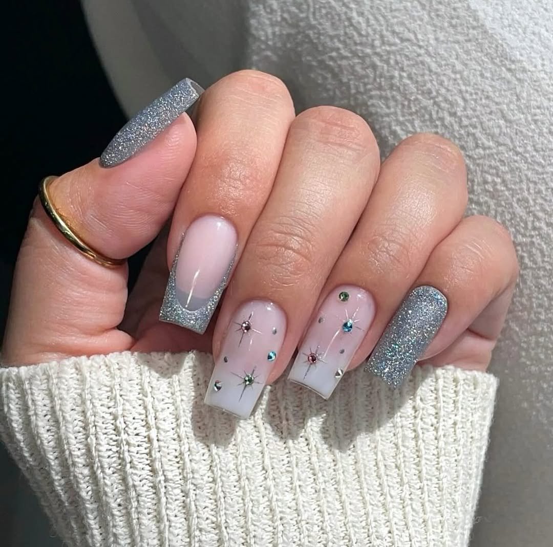 These nails are giving winter-glam in the most effortless way. The frosty glitter tips melt into a soft blush base, and those tiny starburst gems feel like someone bottled the night sky just for your fingertips. It’s the kind of set that looks good with literally anything—sweaters, sparkles, or even just holding your iced latte.