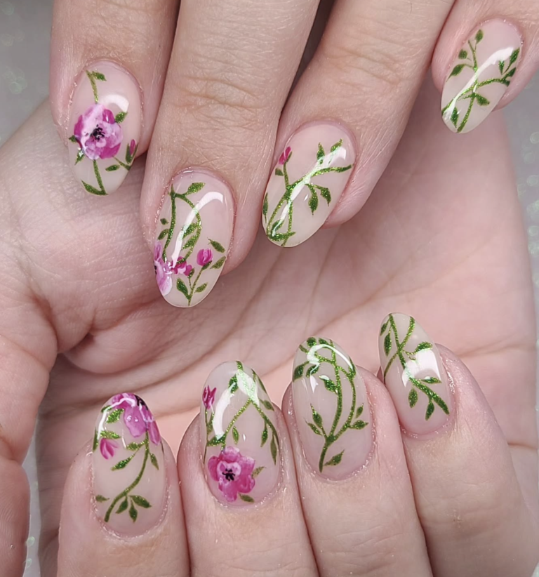 These crisp white nails with soft leafy detailing feel like a deep breath of fresh air. They’re clean, minimal, and still give you that little whisper of artistry without trying too hard. The matte finish pulls everything together in the most “winter-but-still-hopeful-for-spring” kind of way.