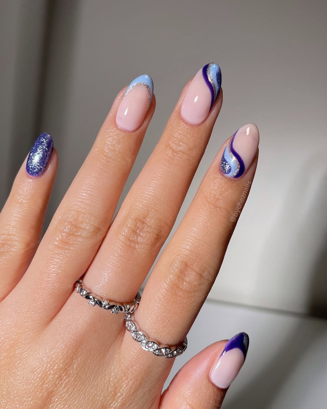If January had a rhythm, it would look exactly like these swirly blue accents. Between the glossy icy-blue French and the shimmering cobalt waves, this set manages to feel playful and sophisticated all at once.