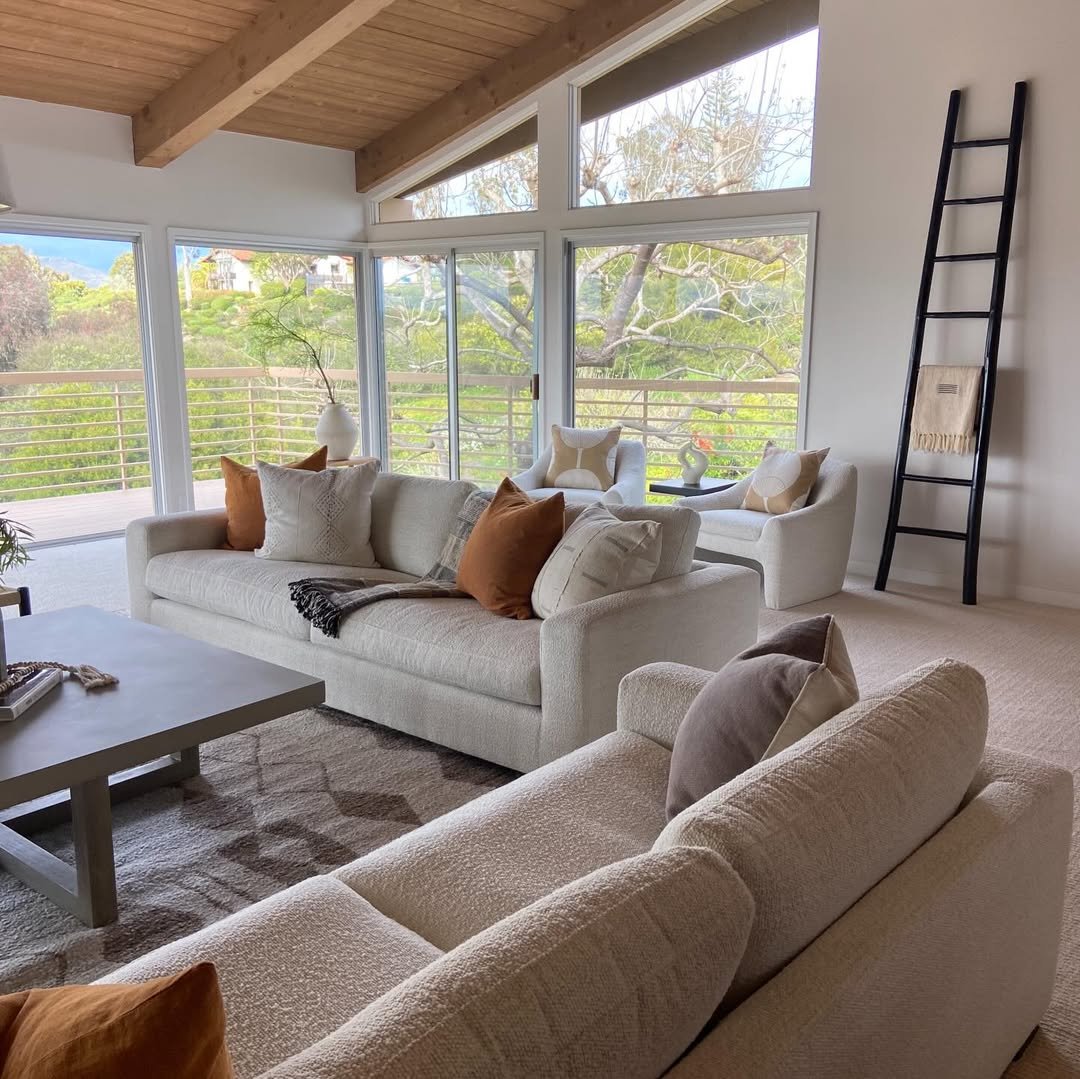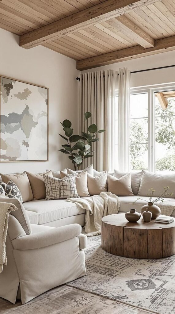 This space feels like a deep breath. Light pours in through those expansive windows, bouncing off soft upholstery and warm wood beams overhead. The palette stays grounded in creams and sandy browns, but those rust-toned pillows add just enough contrast to keep things from feeling flat.