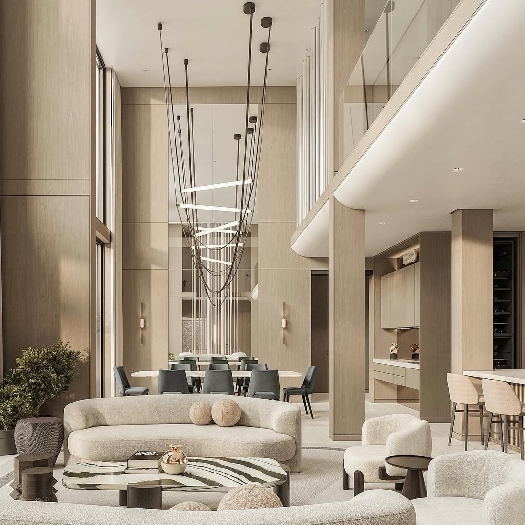 There’s something almost meditative about the scale here. Soaring ceilings, layered wood panels, and those cascading pendant lights create a sense of calm that feels grounded despite the height.