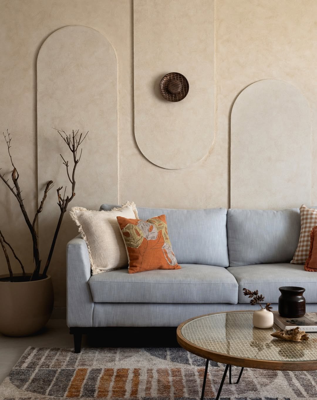 A soft gray sofa meets warm-toned cushions and a textured wall that quietly adds depth. It’s subtle, but it keeps the space from feeling too flat.