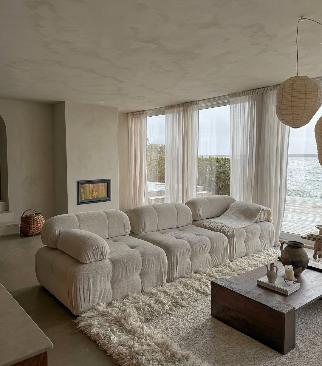 There’s something undeniably inviting about this sofa. Oversized, pillowy, and wrapped in soft fabric, it practically pulls you in. Paired with sheer curtains and that view beyond, the whole room feels like a quiet retreat.