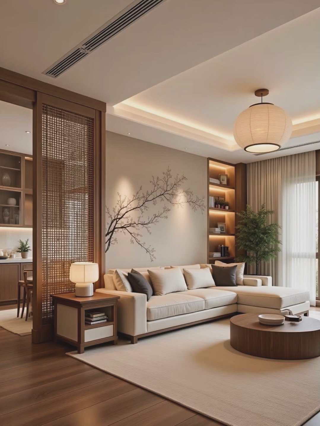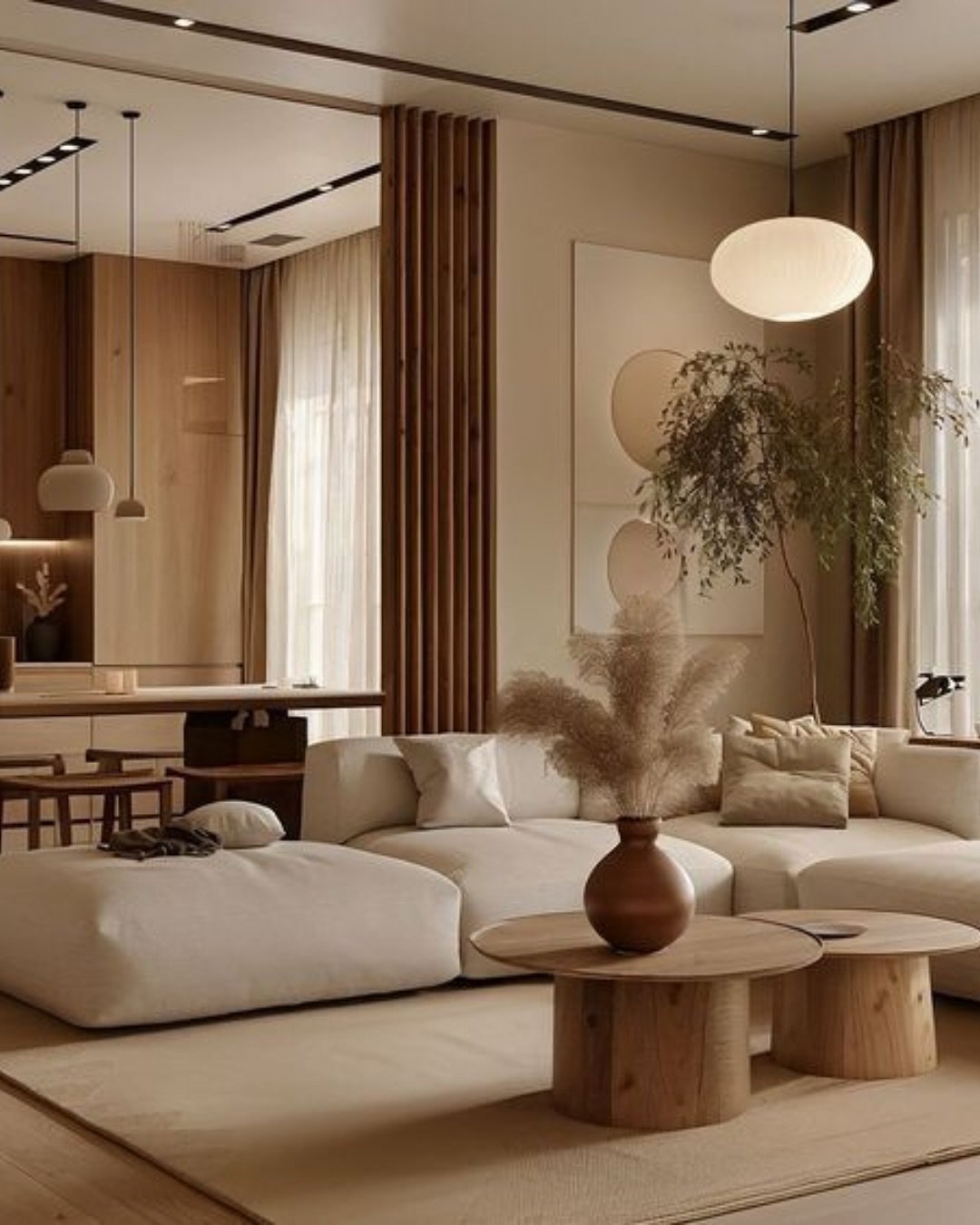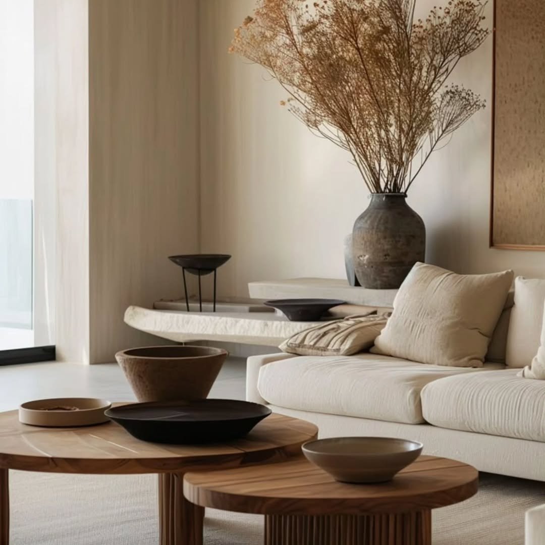 This room leans slightly more modern, but it keeps that Japandi warmth intact. Muted tones, sculptural furniture, and layered textiles give the space depth without cluttering it.