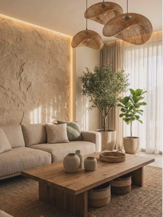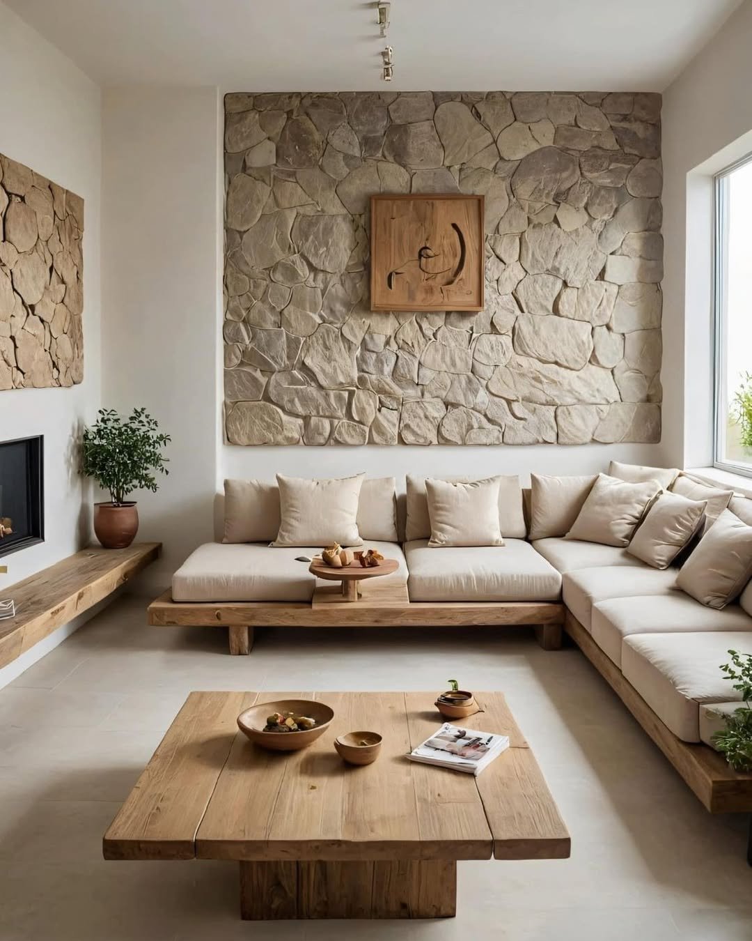 This room leans into texture in the most beautiful way. That stone feature wall anchors everything, giving the space weight, while the low wooden seating keeps it connected to the floor.