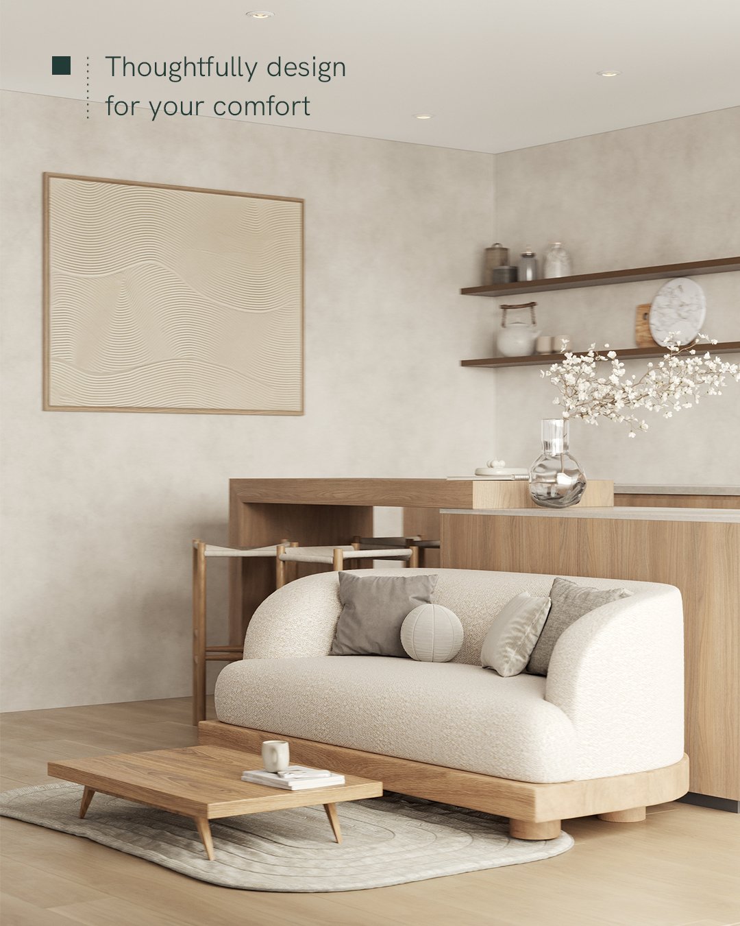 There’s a softness to every edge here. Rounded seating, light wood tones, and a palette that stays close to cream and sand create a space that feels calm without fading into the background.