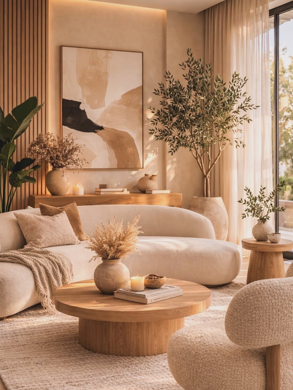 This space feels like it’s permanently set in golden hour. Warm light washes over soft curves, textured fabrics, and natural wood finishes, creating a glow that feels almost cinematic.