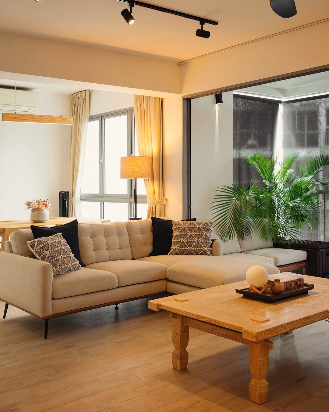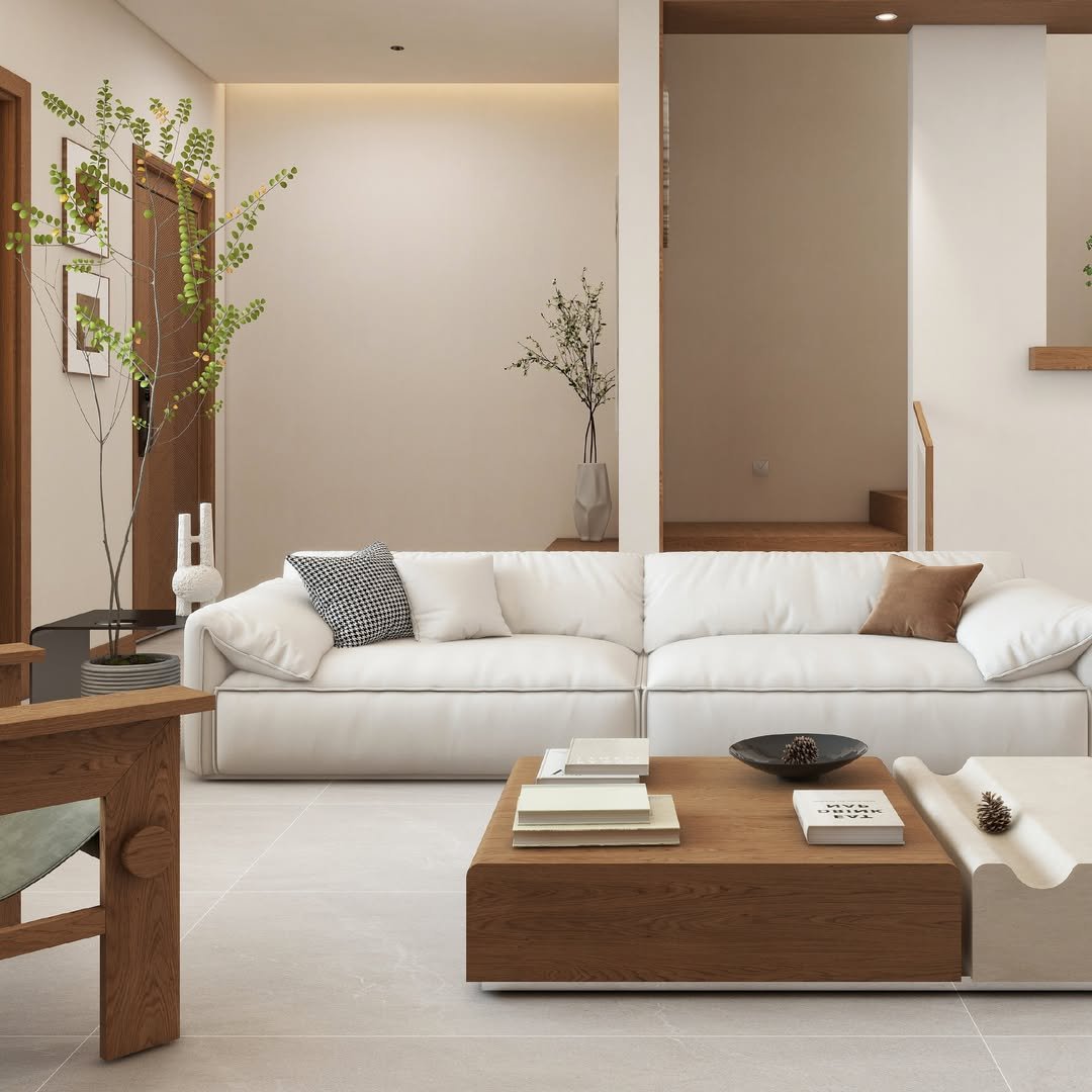 A creamy sofa, a solid wood table, and just a few carefully placed objects. It’s simple, but it doesn’t feel empty.