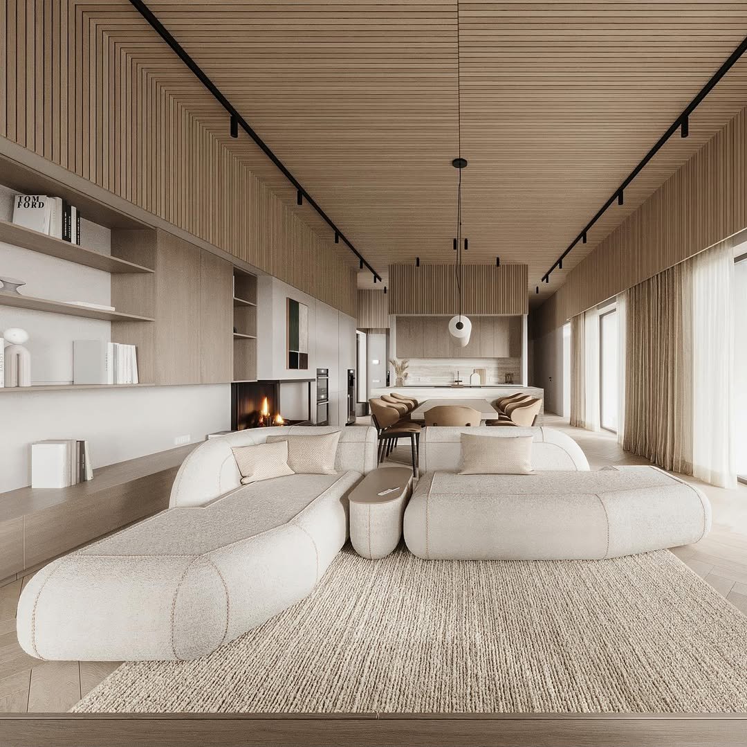 This room plays with structure in the most refined way. The slatted ceiling draws your eye across the space, while the low, curved seating keeps everything grounded and relaxed.