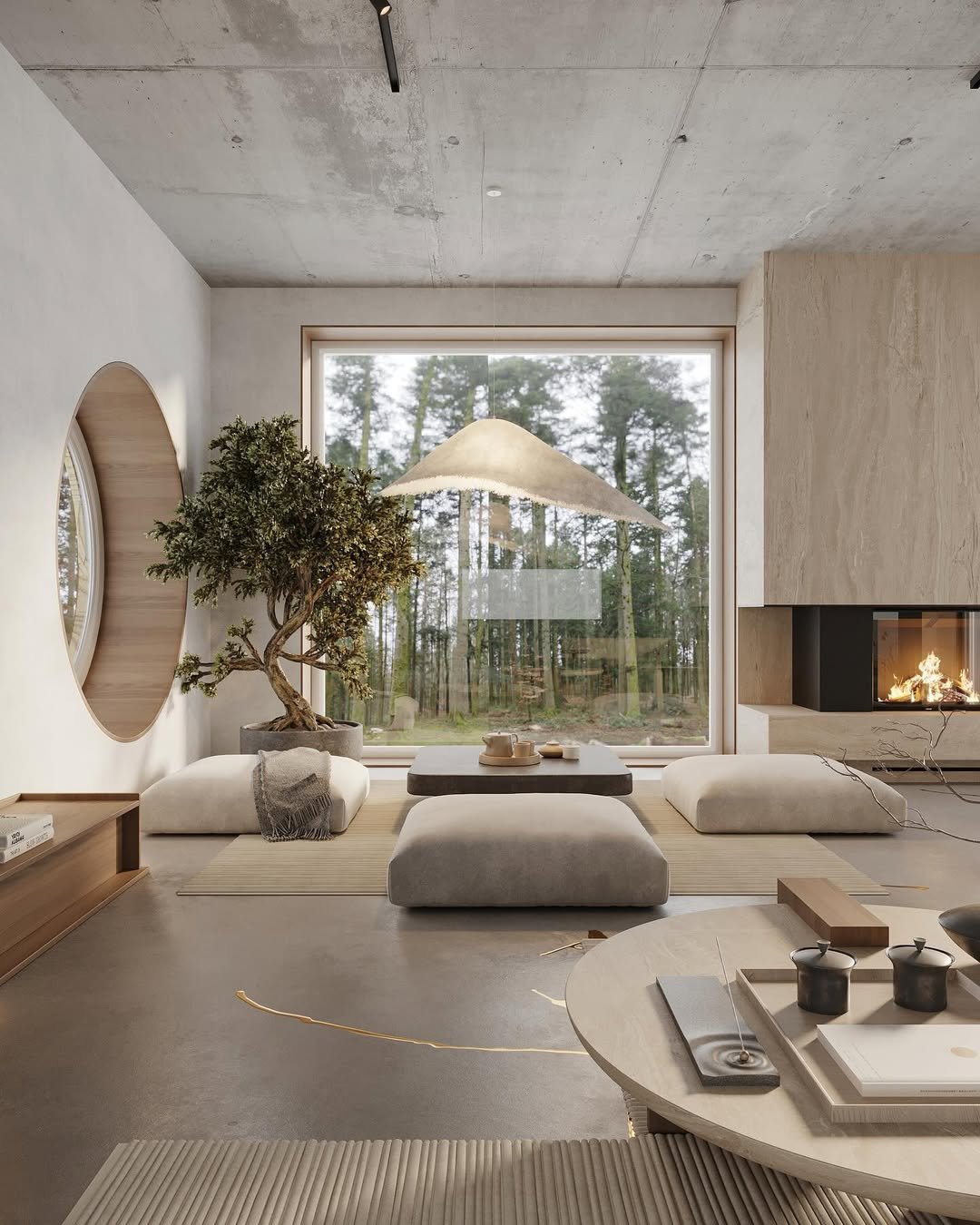 That oversized window steals the show, framing the outdoors like a living piece of art. Low seating and simple forms keep the focus where it belongs, on light, nature, and stillness.