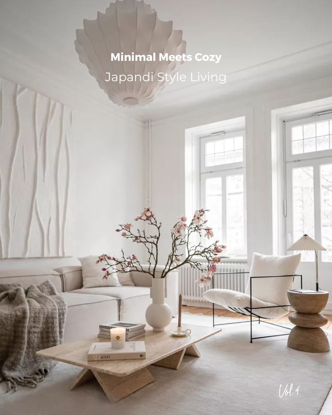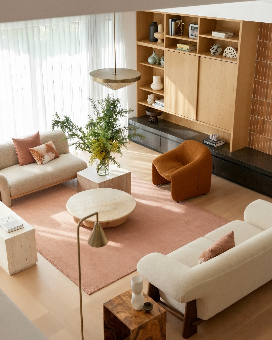This space feels like a quiet exhale. Pale walls, low-slung furniture, and that sculptural pendant overhead create a room that doesn’t compete for attention, it simply settles you in. The soft blush branches on the coffee table add just enough life, like a fleeting moment of spring held indoors.