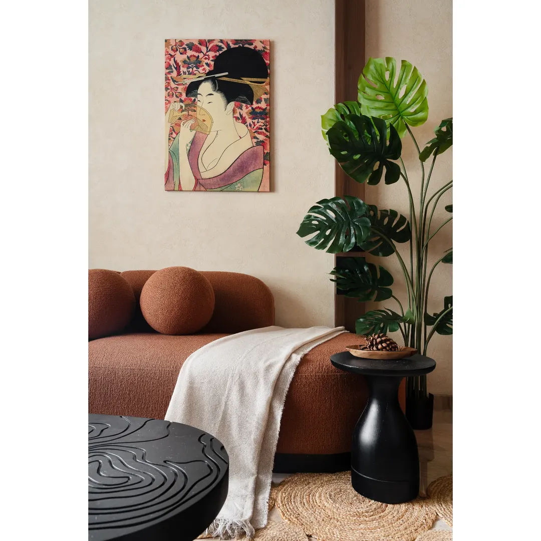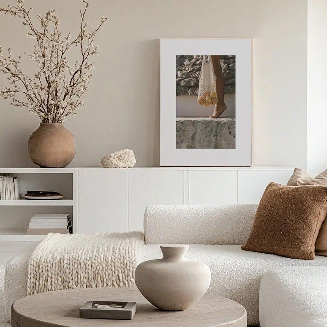 There’s a softness here that feels almost personal. A boucle sofa, a chunky knit throw, and that perfectly imperfect ceramic vase set the tone for a space that feels lived in without looking busy. Even the artwork leans subtle, like it’s meant to be discovered rather than noticed right away.