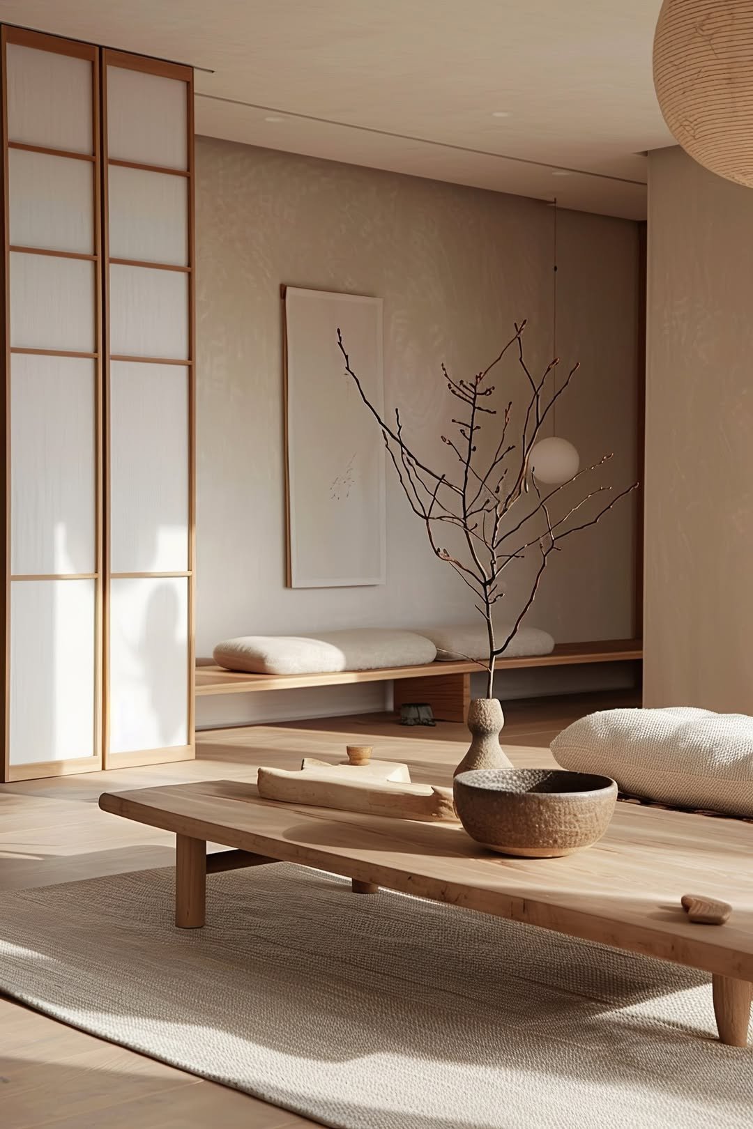 There’s a quiet discipline to this room. Low furniture, clean lines, and that single branch arrangement become the focal point without trying too hard. Even the sliding panels feel like they belong to a slower, more intentional rhythm.