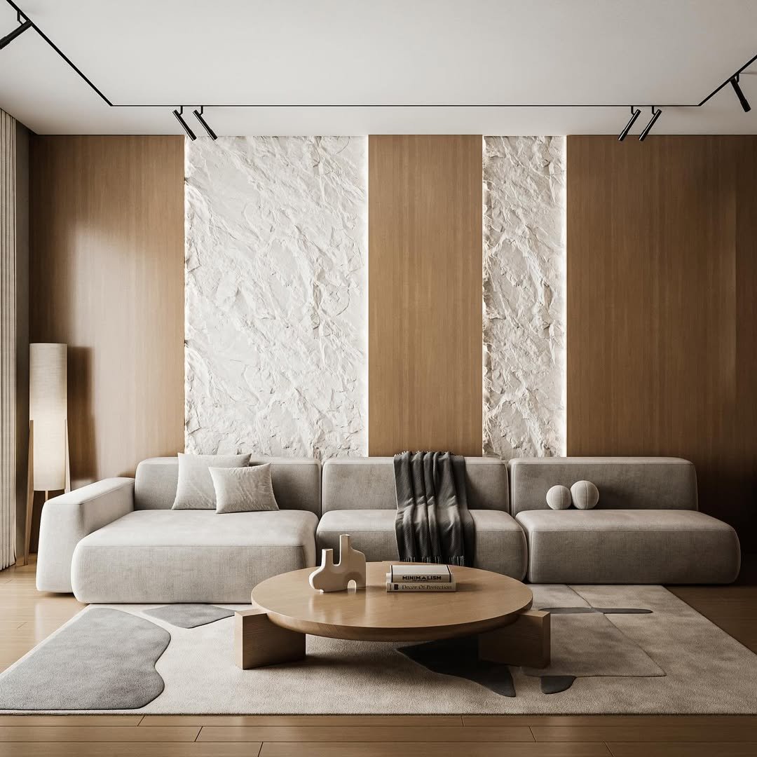 This one leans into contrast, but keeps it refined. Smooth wood panels meet raw, textured stone, and the soft seating balances it all out. It’s a mix that could feel heavy, yet somehow stays light.