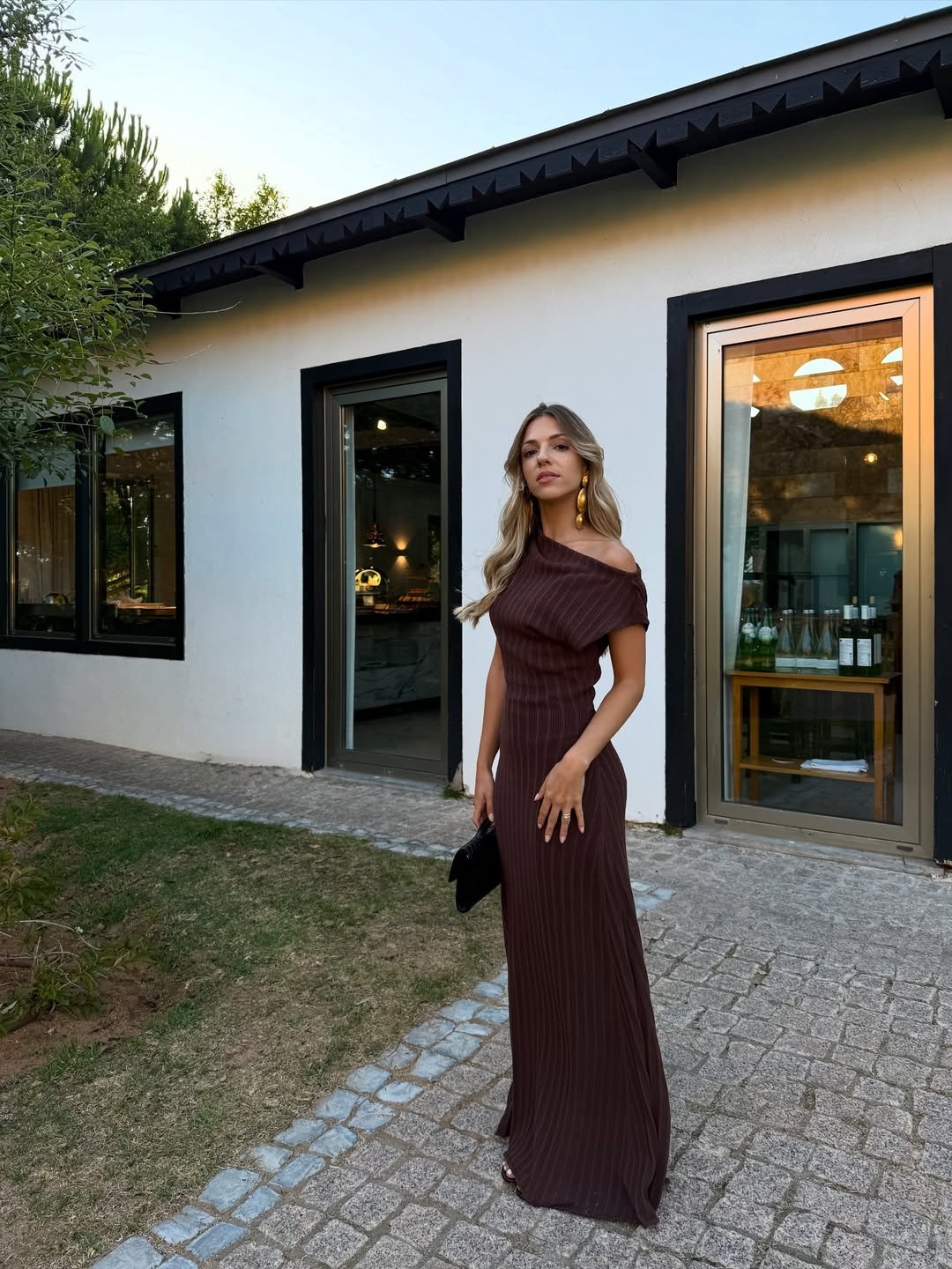 There’s a richness to this deep brown dress that feels made for late July evenings. The off-shoulder neckline softens the silhouette, while the vertical texture keeps it sleek and elongating. It catches that golden-hour light in the most subtle way, almost like it was designed for it.