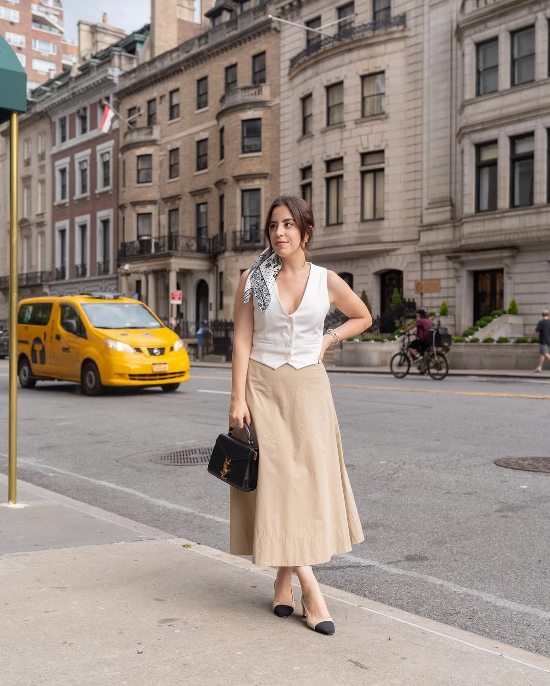 A tailored vest paired with a soft midi skirt feels like summer in the city, clean, confident, and quietly stylish. The neutral palette keeps things grounded, while the scarf detail adds just enough personality.