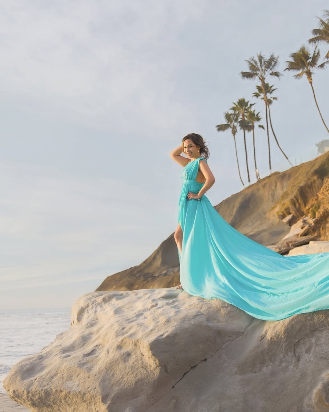 This dress moves like it belongs to the wind. The airy aqua fabric trails behind, catching light and breeze in a way that feels almost cinematic. Set against cliffs and ocean, it becomes less about the dress and more about the feeling it creates.
