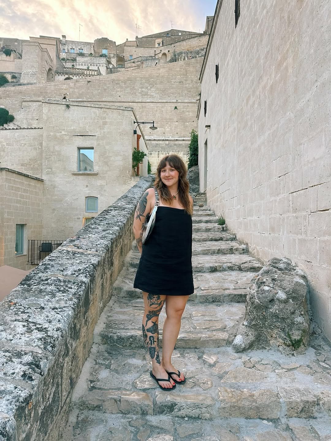 A simple black mini always finds its place, but this one feels especially grounded against the old stone backdrop. The clean lines, the barely-there straps, it’s understated in a way that feels intentional rather than basic.