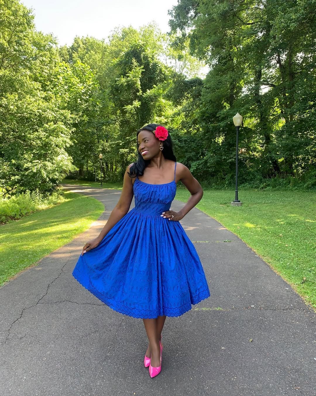 This dress brings joy the moment you see it. The vibrant blue, the flared skirt, the playful movement, it feels like summer captured in a single piece. Add that pop of pink in the accessories and suddenly it feels even more alive.