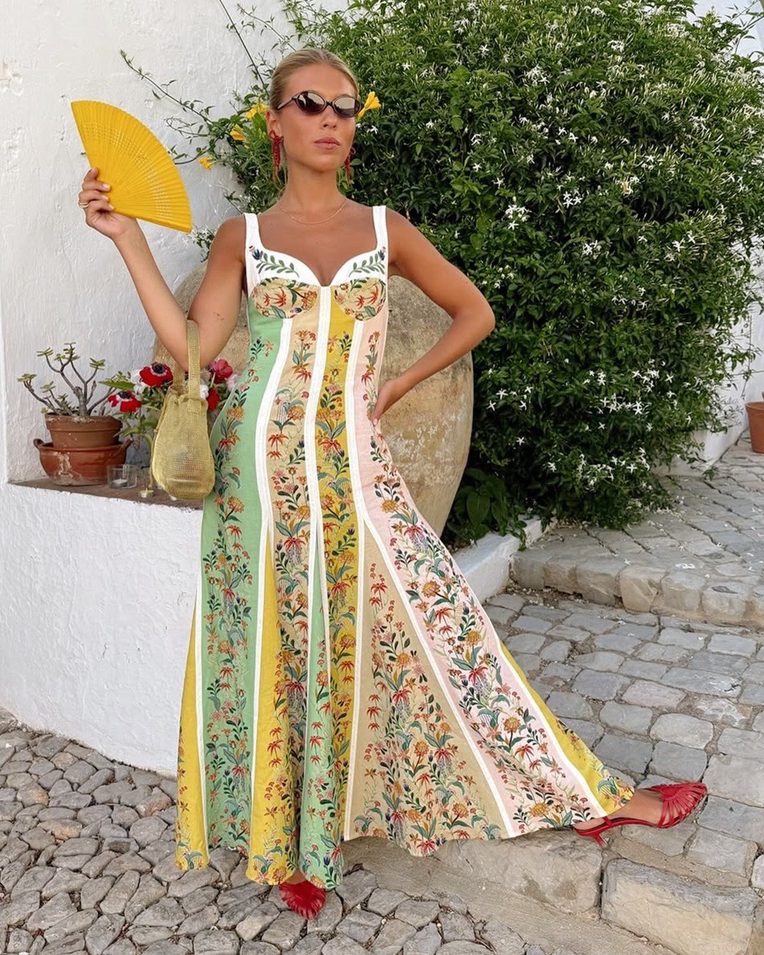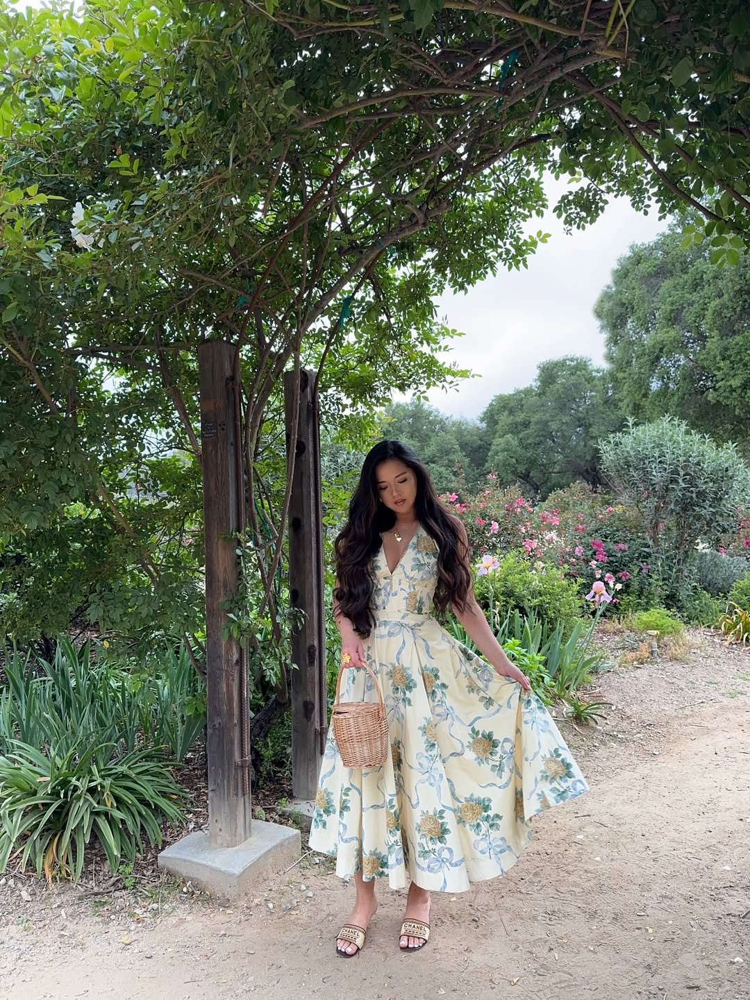 Soft florals, a flowing skirt, and a silhouette that feels both feminine and grounded, this look leans into timeless summer dressing. The structured bodice balances the volume, creating a shape that feels intentional but still easy.