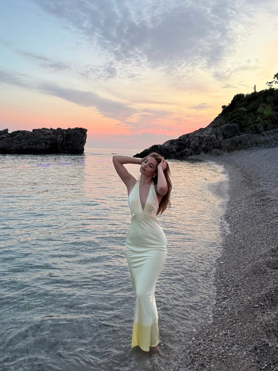 There’s something almost dreamlike about this pale yellow dress against the shoreline. The soft gradient melts into the surroundings, creating a look that feels light and fluid.