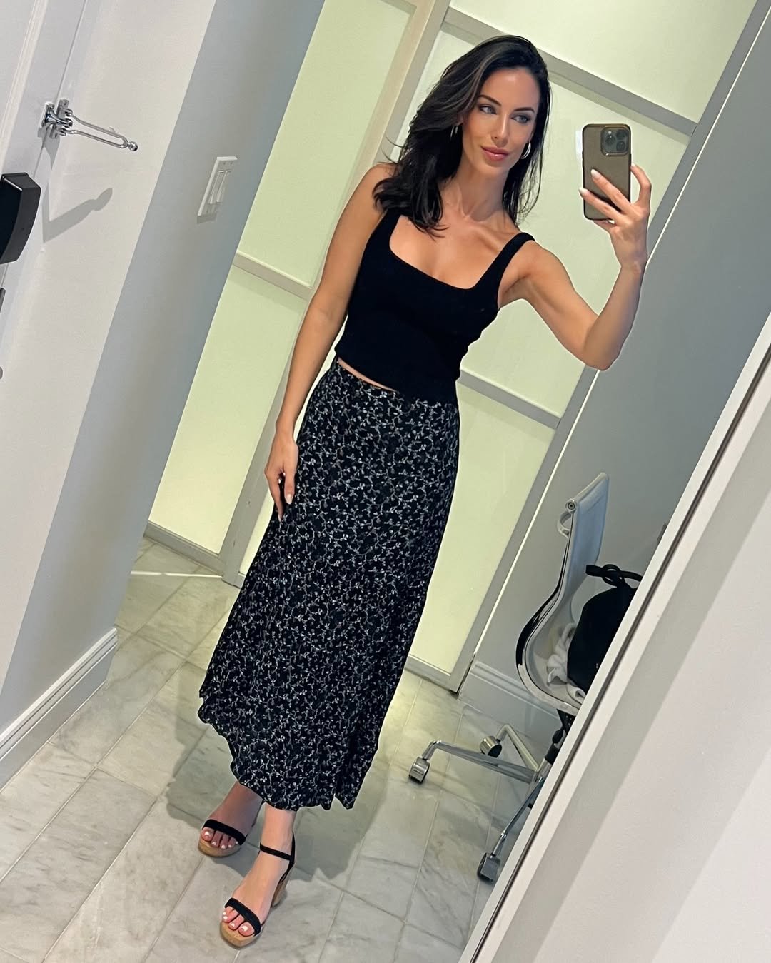 A black tank and a printed midi skirt might not be the first thing that comes to mind for July, but it works. The contrast keeps it sharp, while the lighter fabric of the skirt softens the overall feel.