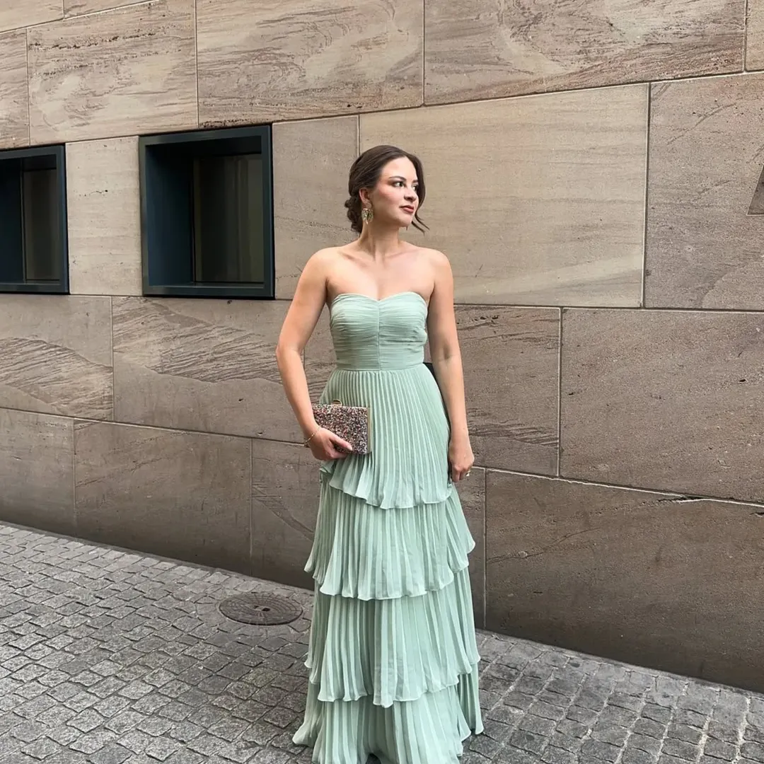 There’s a quiet drama in this flowing mint dress. The pleated layers create movement without needing embellishment, and the soft structure at the bodice keeps everything refined and balanced.