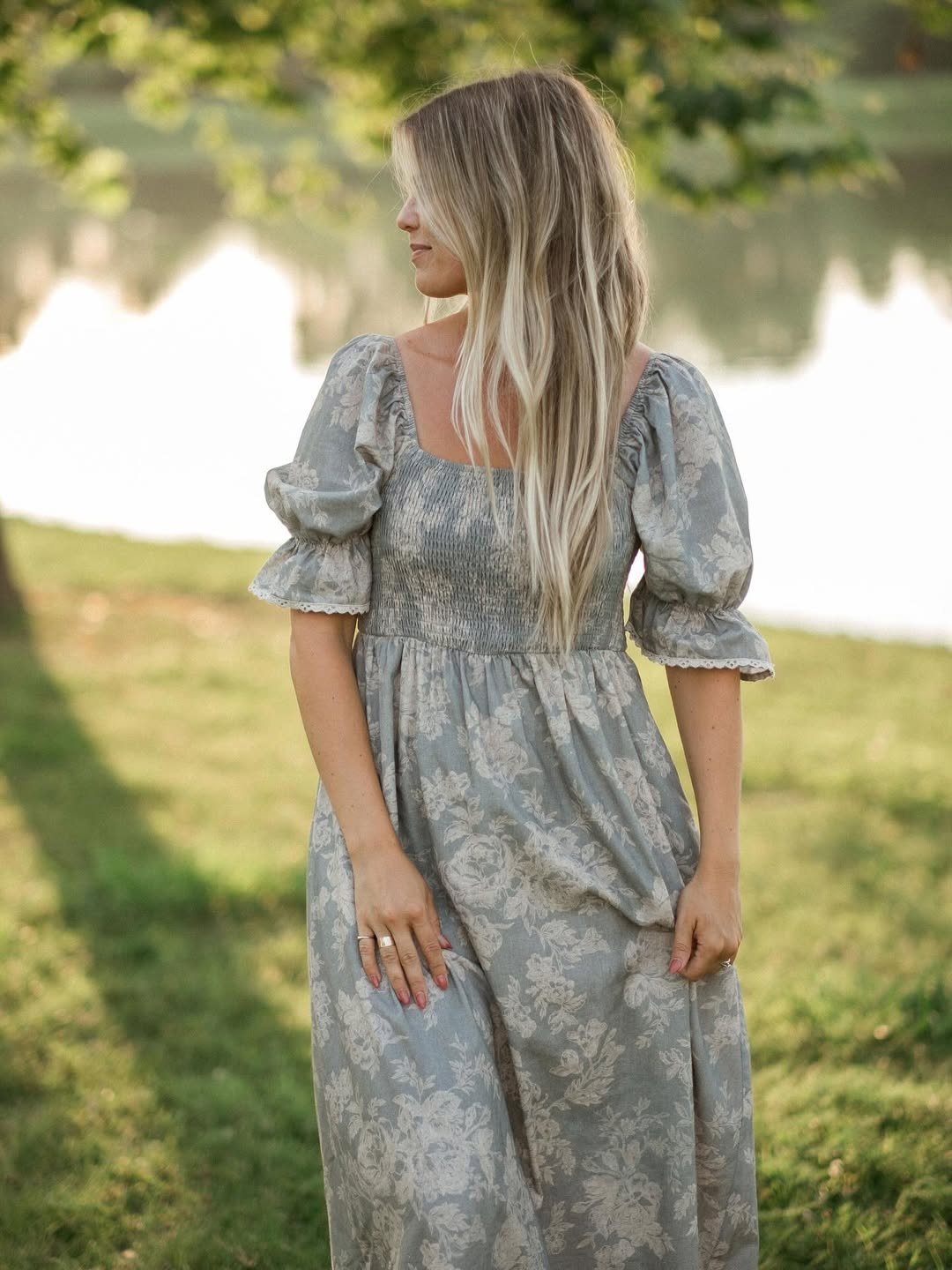 Dusty tones and subtle florals come together in a way that feels calm and grounded. The puff sleeves add a hint of volume, while the smocked bodice keeps everything balanced and easy to wear.