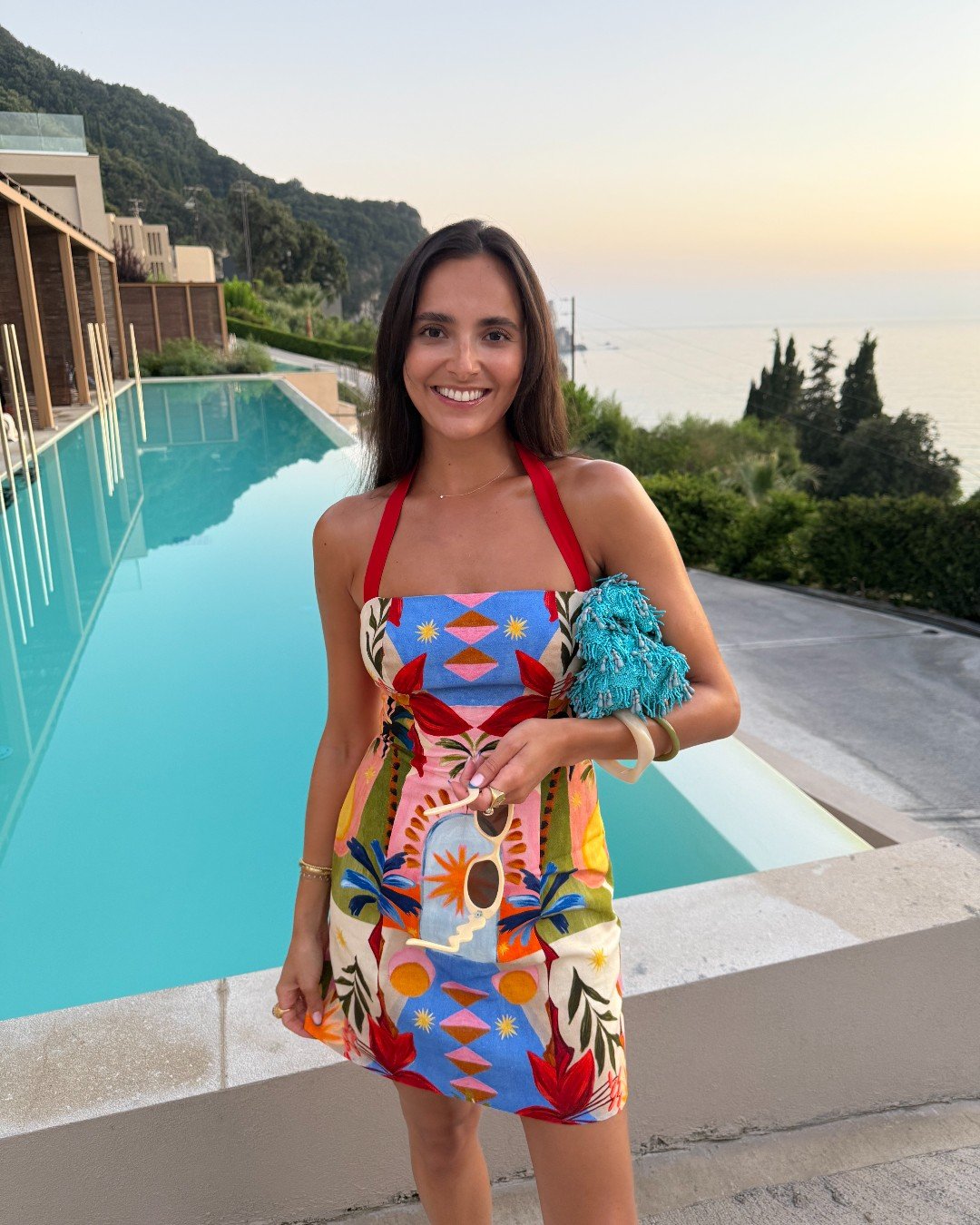 Bright, graphic, and full of personality, this mini dress feels made for vacation days that stretch into sunset. The playful mix of colors stands out beautifully against the calm blue of the water.