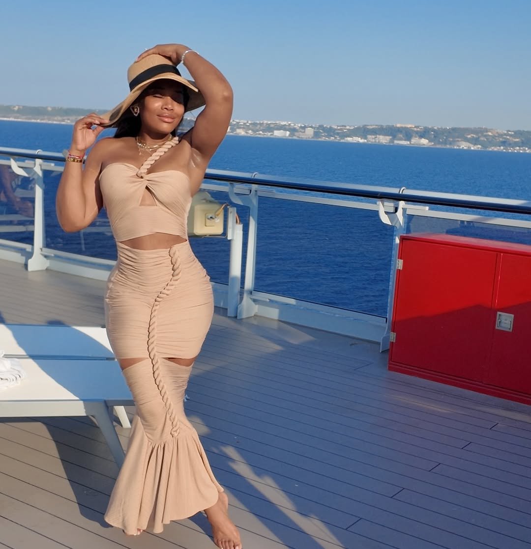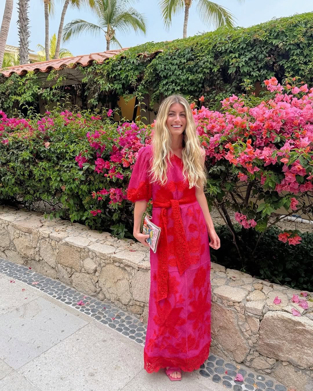 It’s the kind of outfit that doesn’t compete with its surroundings, it complements them. Add a wide-brim hat and layered gold pieces, and it settles right into that relaxed, elevated resort mood.