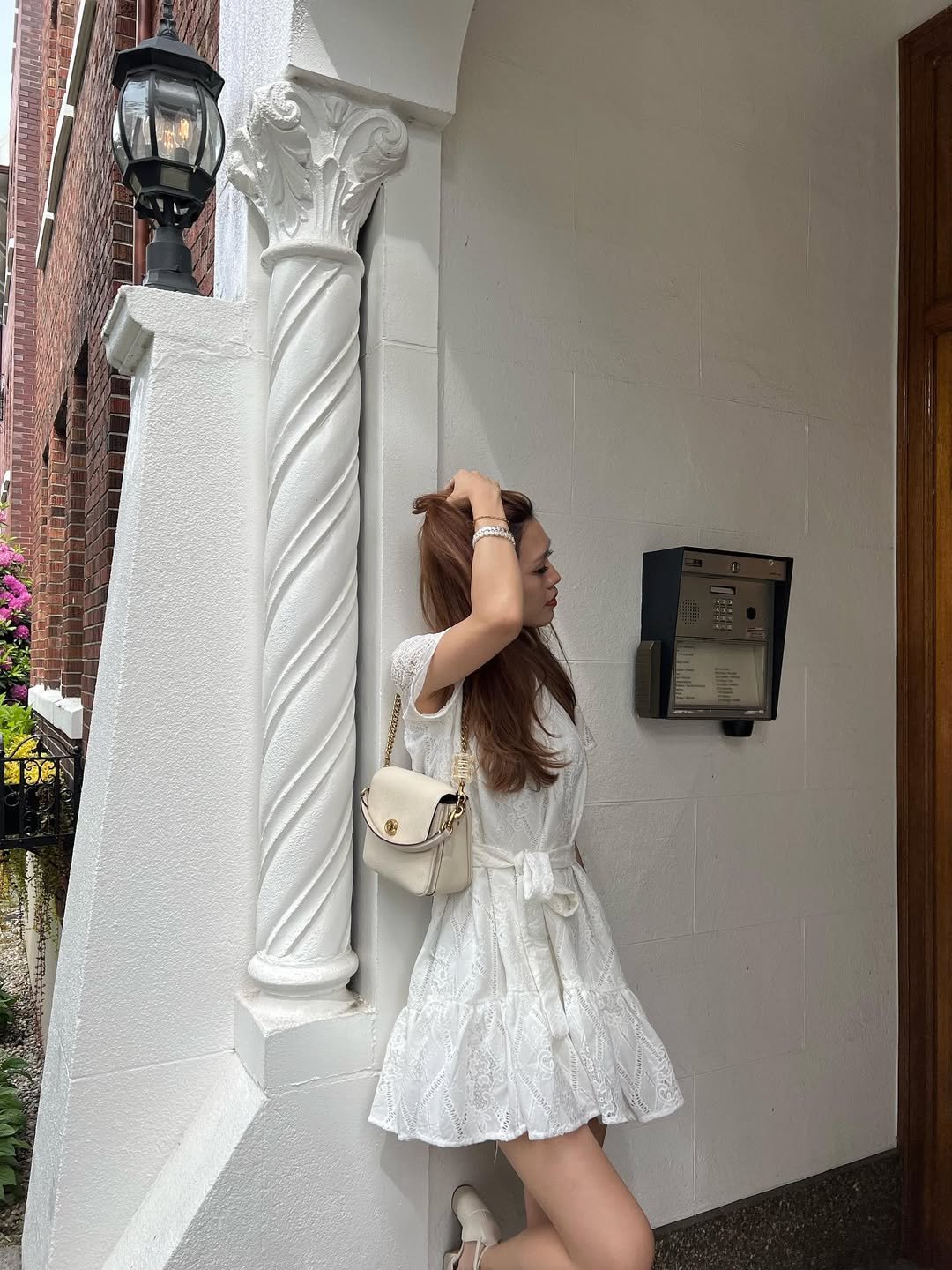 There’s something about a white lace mini in July that just feels right. The delicate texture, the cinched waist, the way it catches soft daylight against crisp architecture, it all leans into that romantic, slow-city energy. Paired with a structured mini bag and barely-there heels, it feels polished without losing that airy ease.