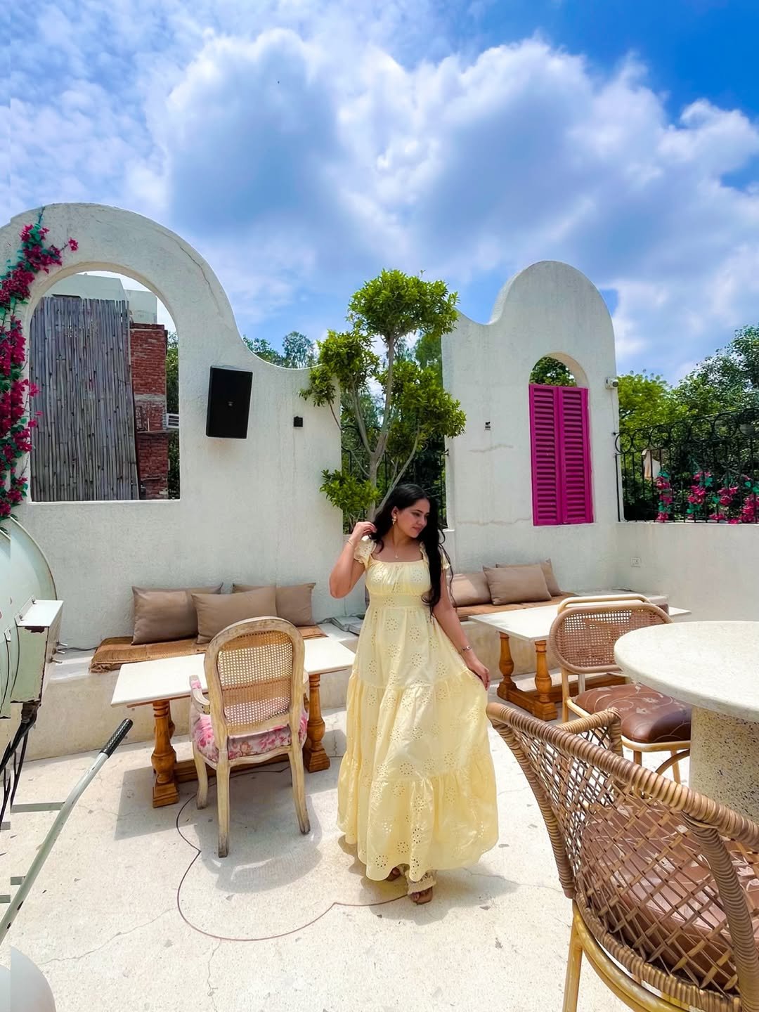 Soft yellow in full sunlight has a way of glowing without trying. The tiered skirt and delicate cutwork details bring texture, while the relaxed fit keeps everything light and breathable. Set against whitewashed walls and woven textures, it feels warm and inviting.
