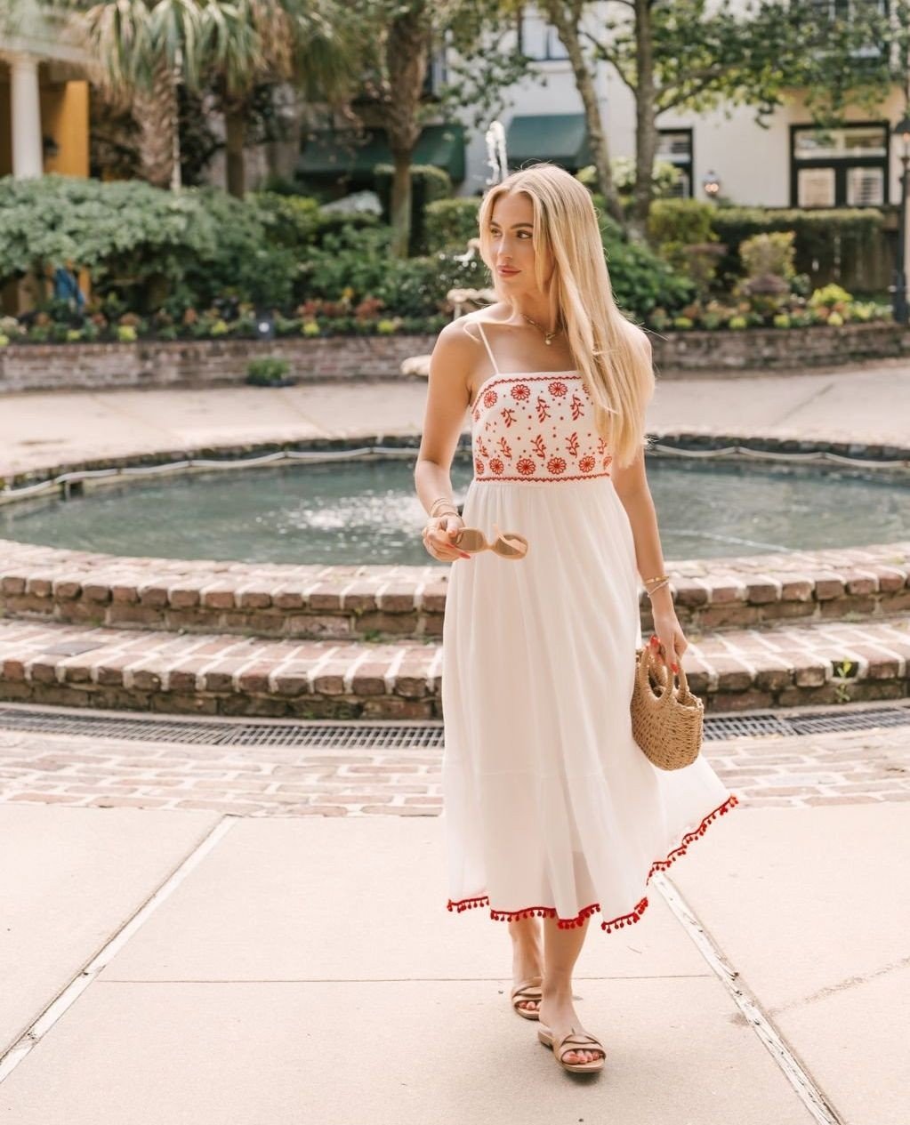 What I love here is the simplicity. A woven bag, flat sandals, and suddenly you have a look that feels thoughtful without trying too hard.