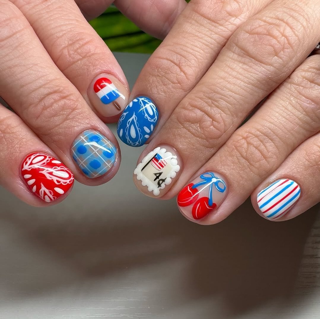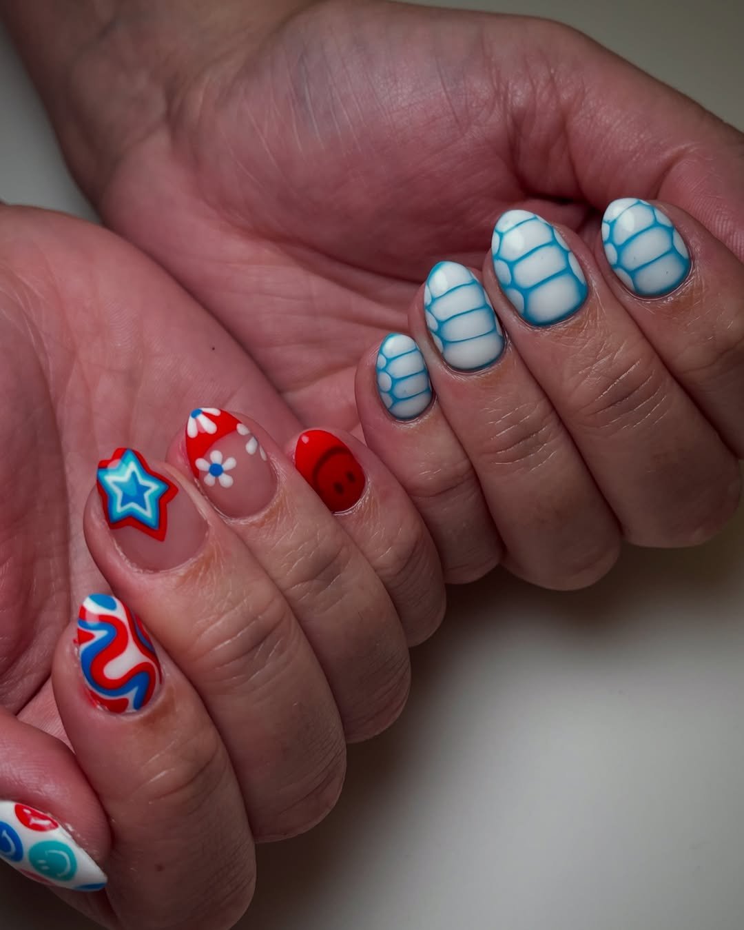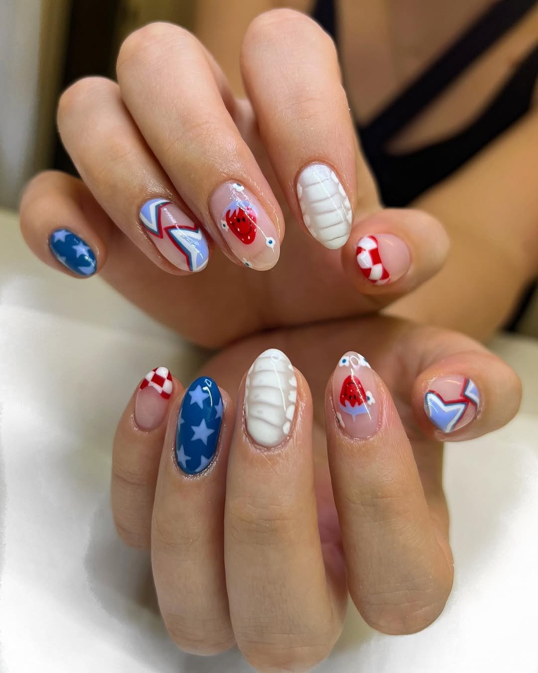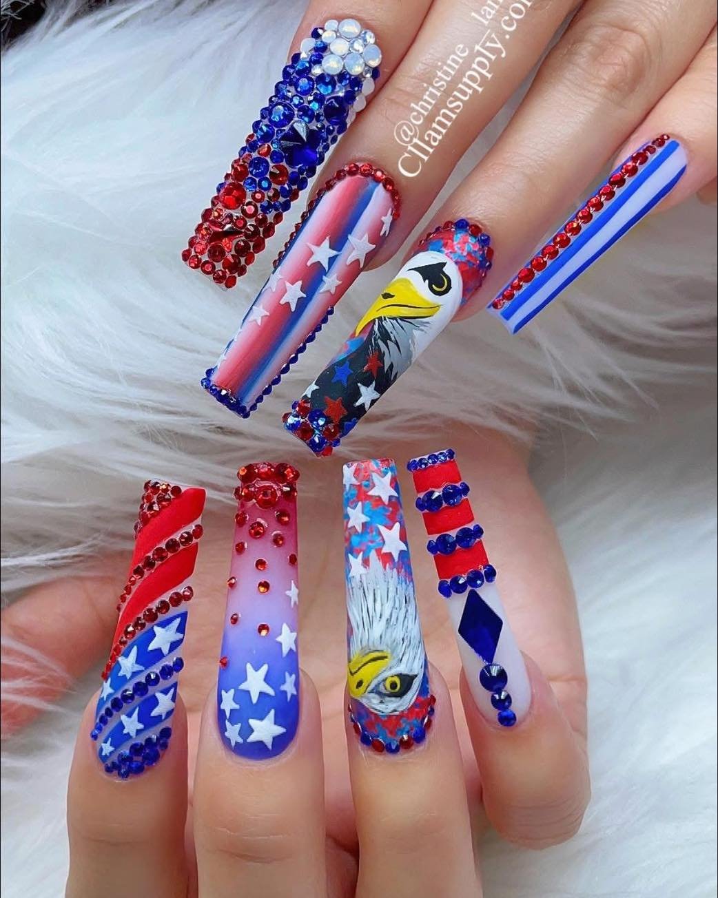 Bold reds, blues, and crystal textures turn each nail into a full statement. From stripes to stars, it leans unapologetically into celebration.