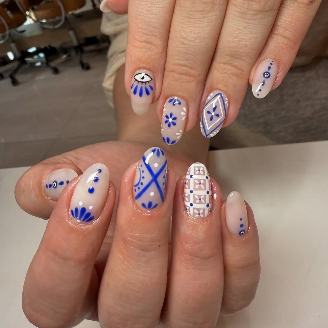 Crisp white bases meet intricate blue detailing inspired by ceramic tiles. Each nail feels like a tiny piece of art, carefully placed.