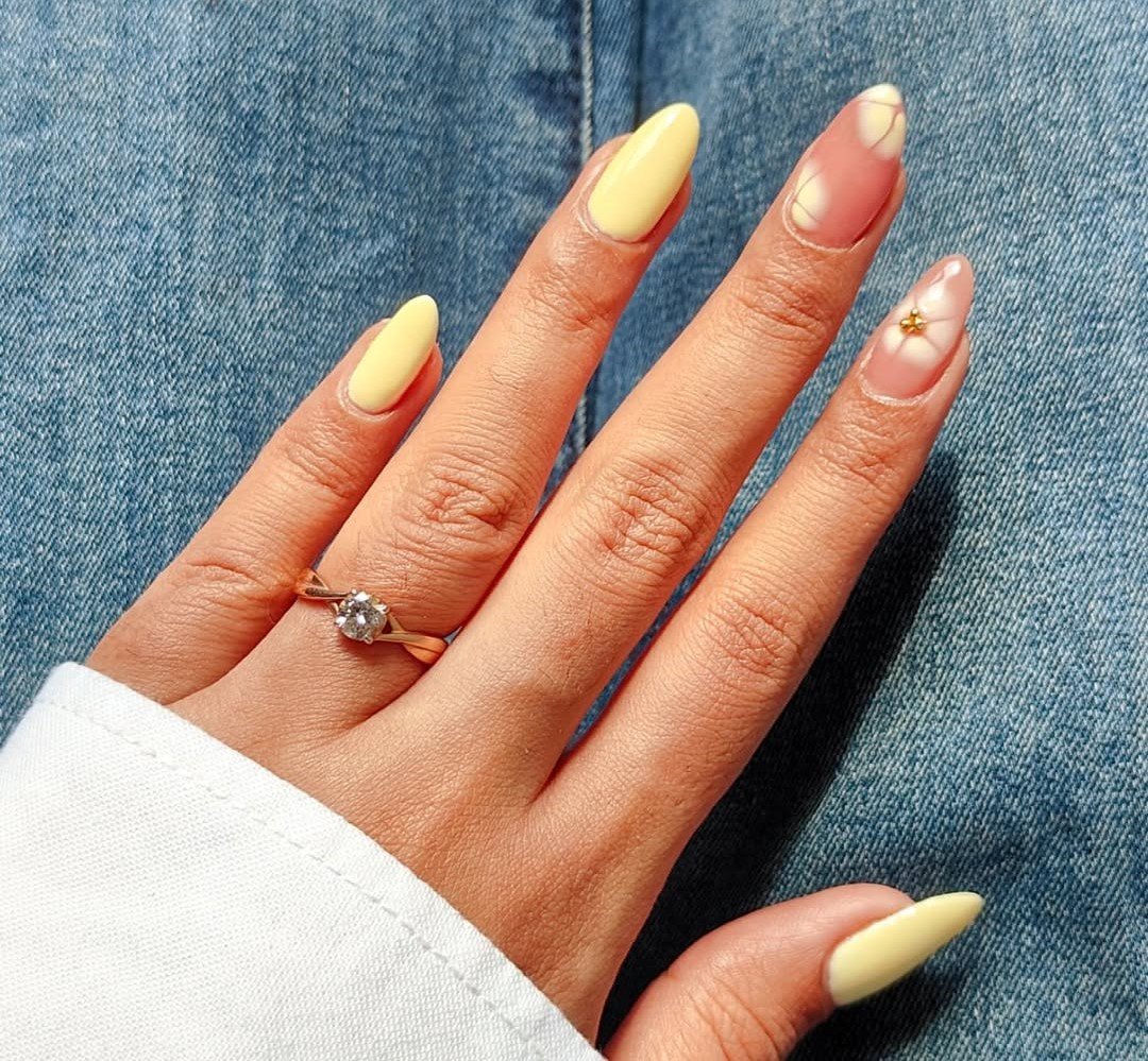 A creamy pastel yellow washes over the nails, softened by delicate floral accents that almost melt into the base. It carries that warm, sunlit softness you only get in early summer afternoons.