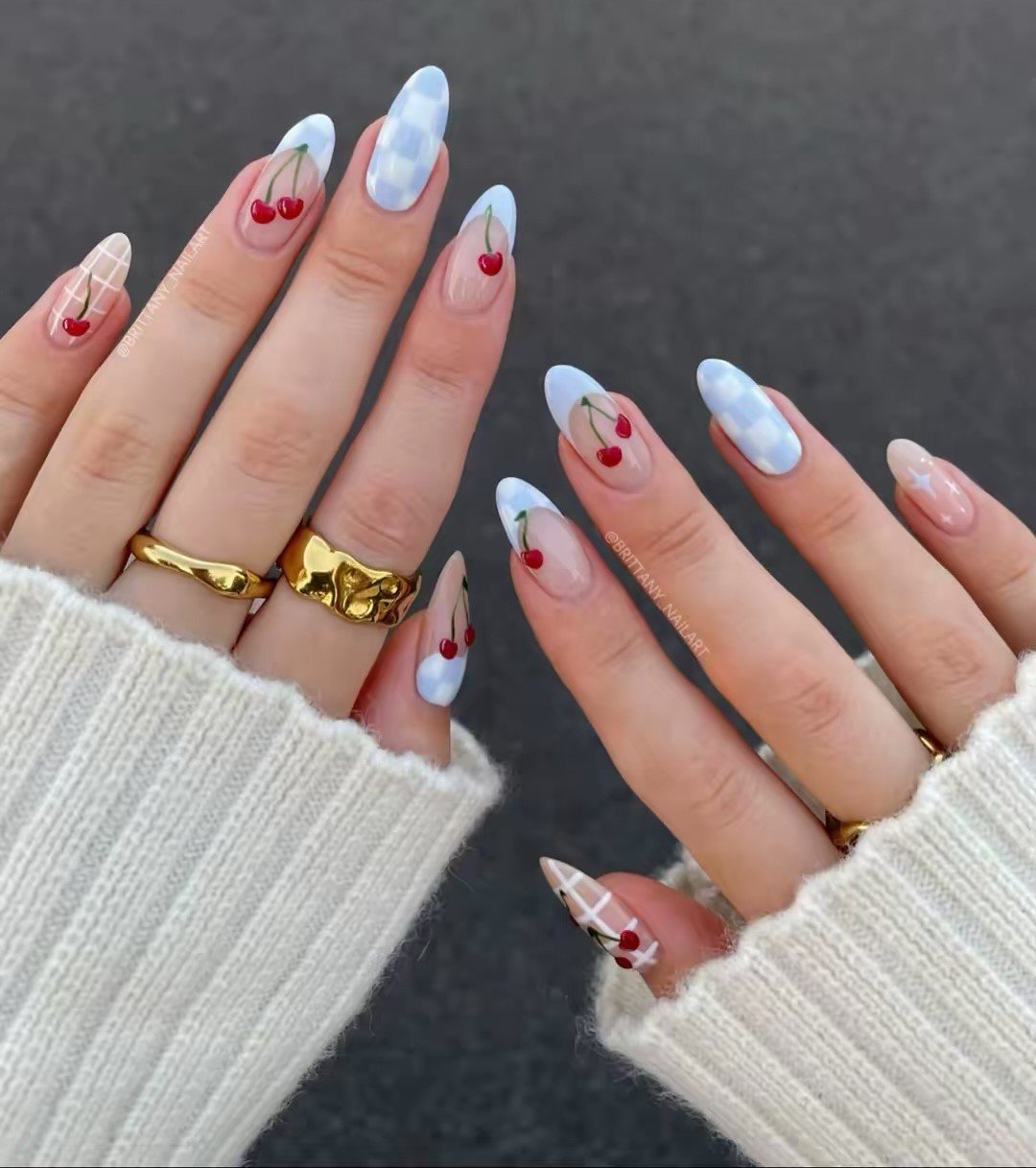 Soft blue tones fade into glossy tips, dotted with tiny cherries that feel straight out of a summer picnic. There’s something sweet and slightly retro woven into the whole palette.