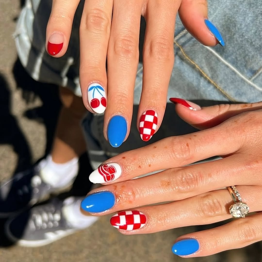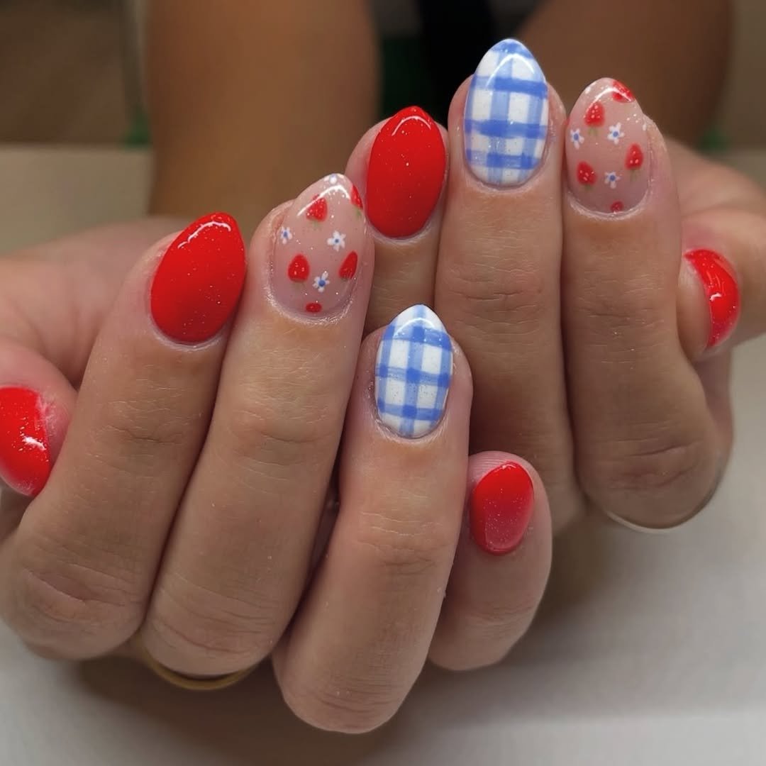 A mix of red polish, baby blue gingham, and scattered strawberries creates that picnic blanket fantasy in the most wearable way. Each nail feels like a tiny snapshot of summer.