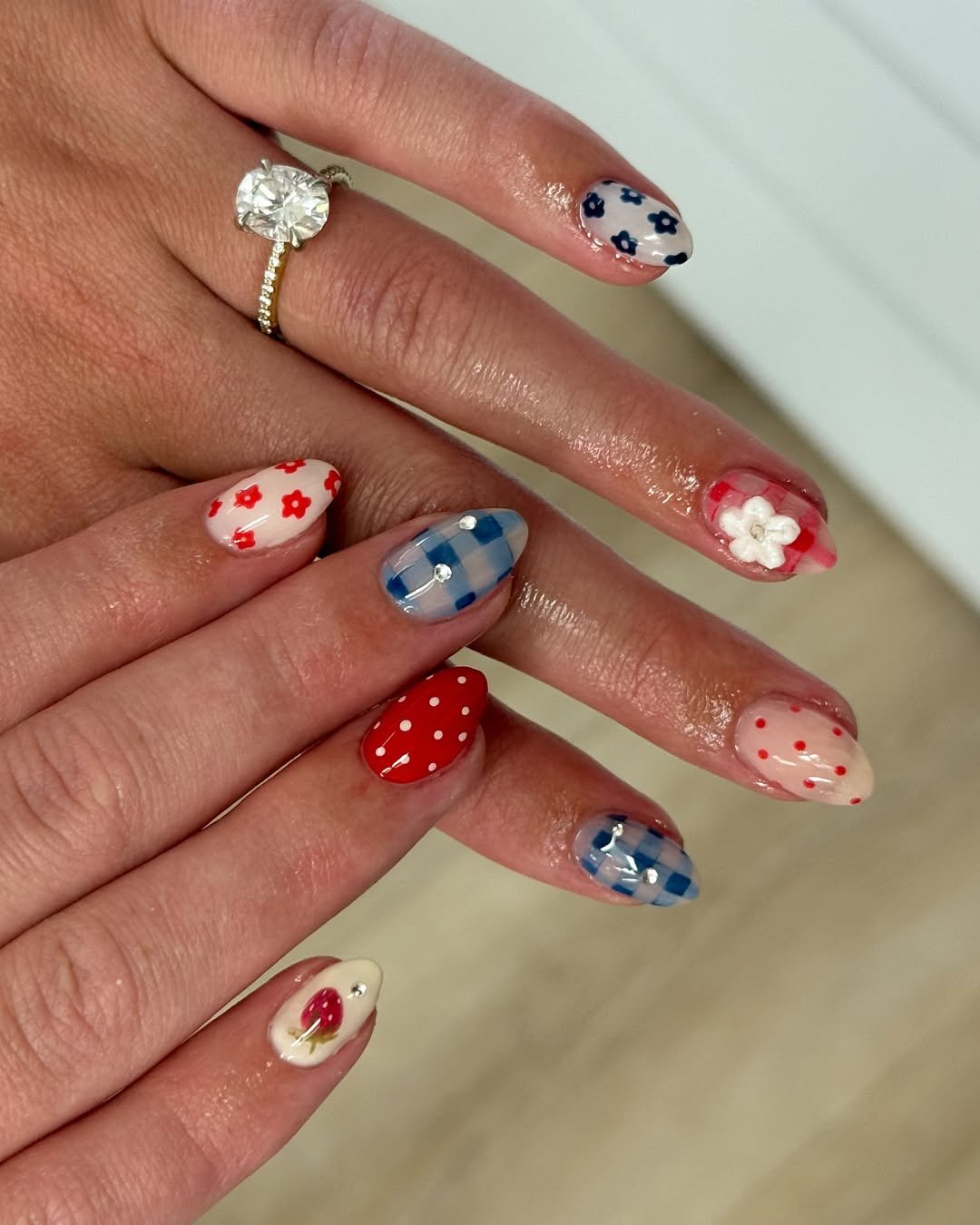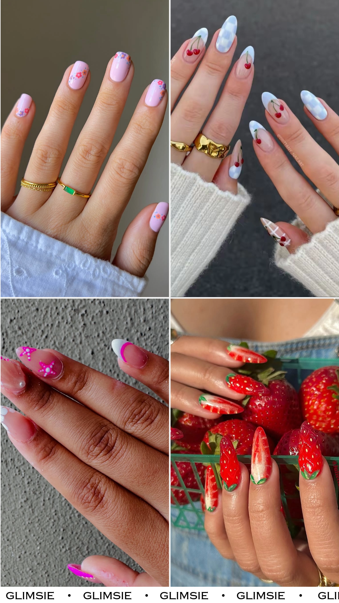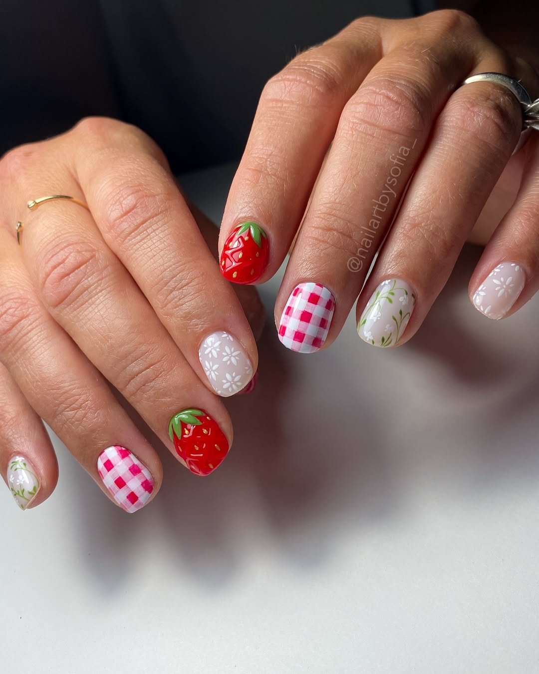 Tiny strawberries, gingham prints, and soft florals come together like a picnic blanket in nail form. It’s sweet, detailed, and full of charm.