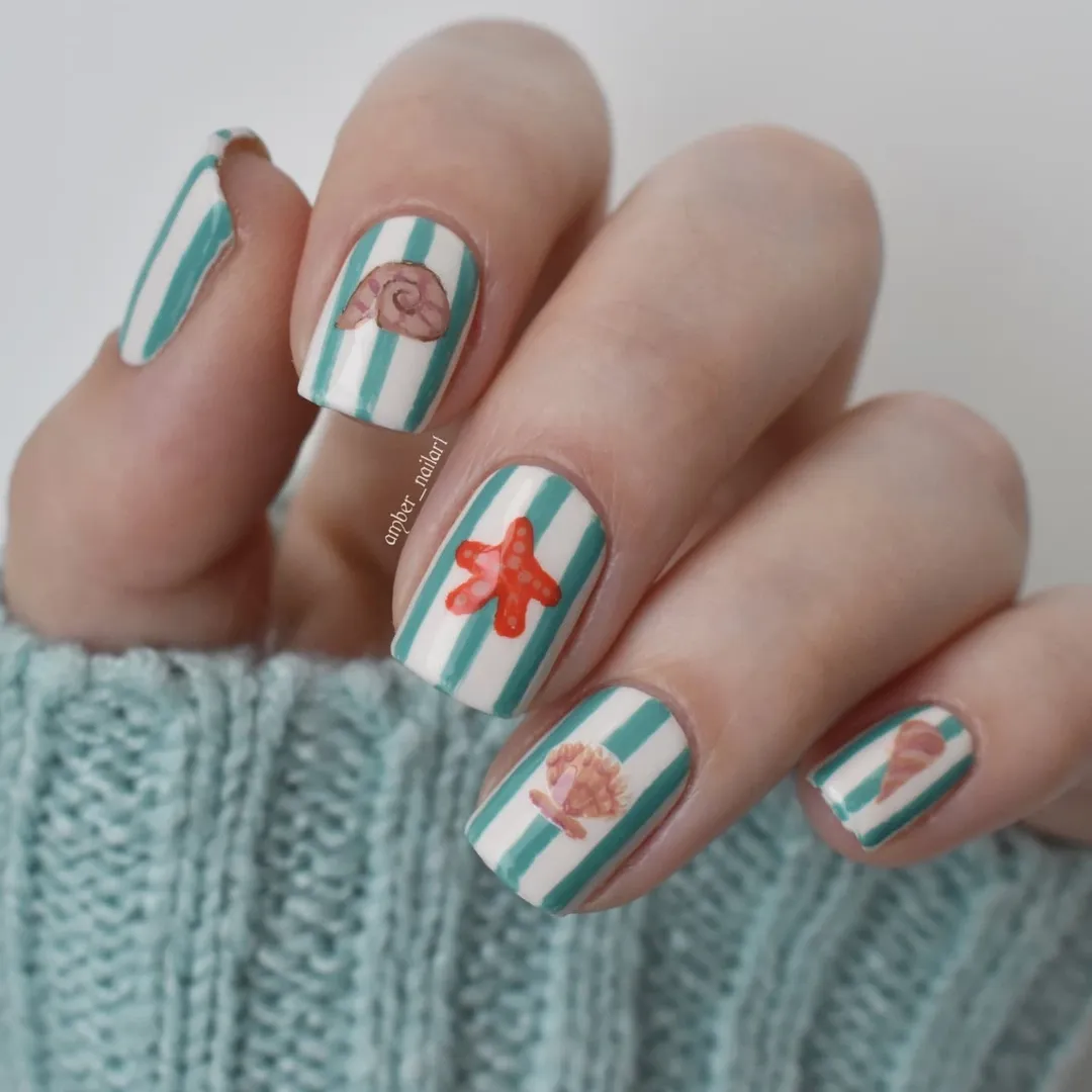 Minty green stripes set the tone, while tiny shells and starfish bring in that seaside nostalgia. It feels like a beach towel, a paperback, and salt in your hair all at once.