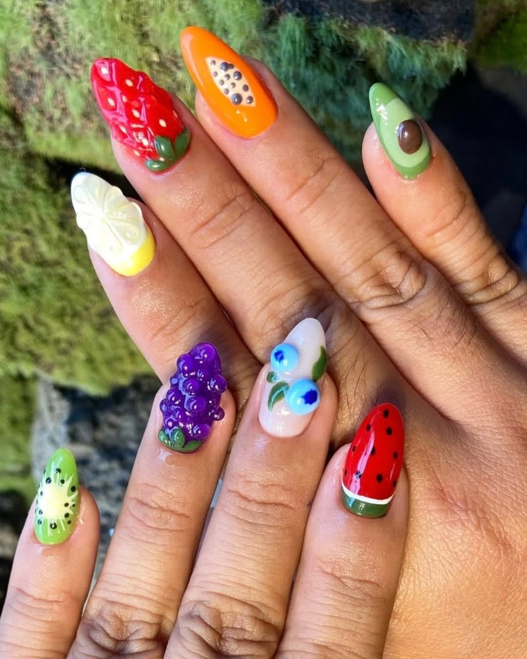 From kiwi to watermelon, each nail turns into a tiny fruit moment with bold color and texture. It’s vibrant and unapologetically fun.