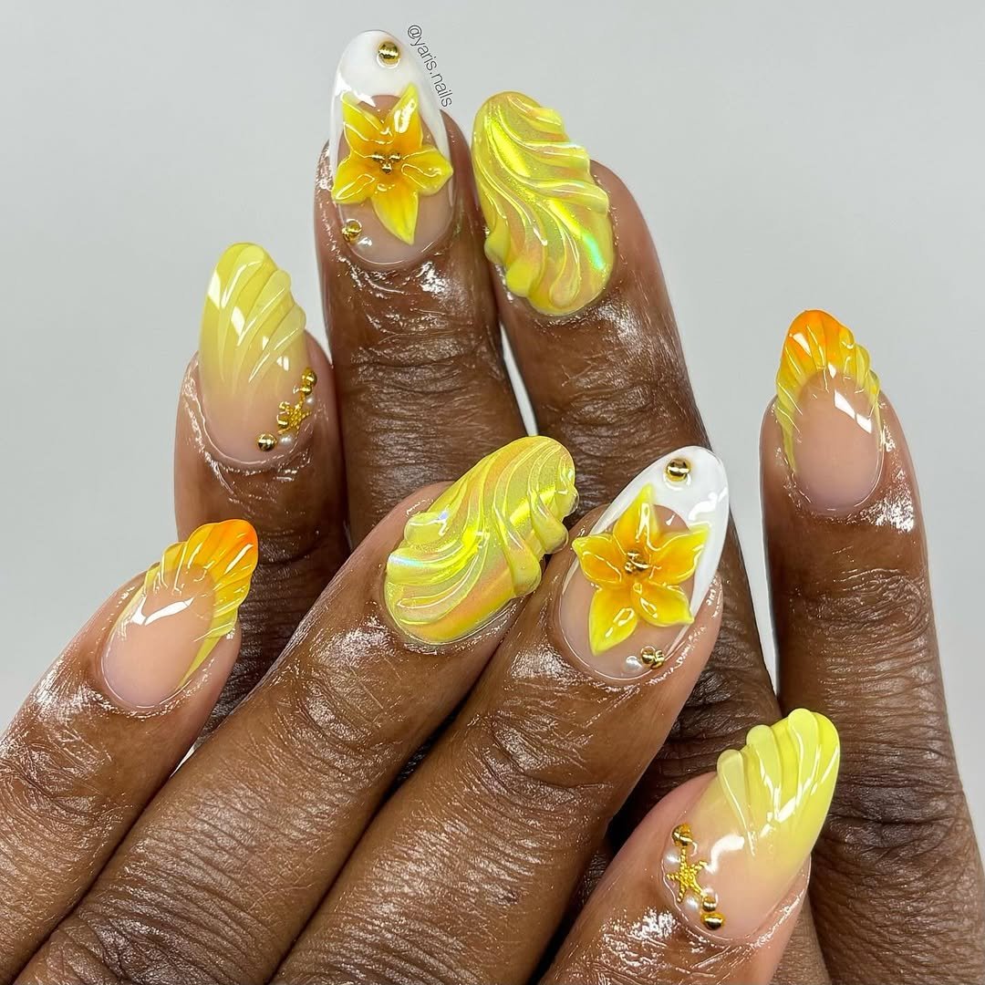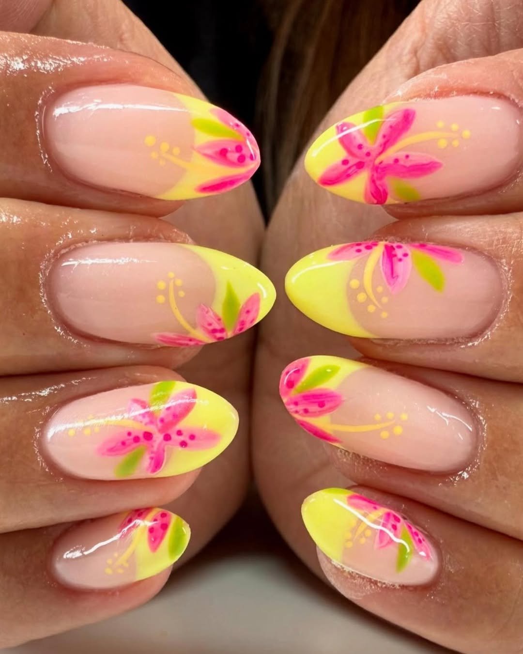 There’s something instantly mood-lifting about this one. A sheer, glossy base keeps things clean, while electric yellow tips melt into hot pink florals that feel almost sunlit. It’s bold, but still airy, like summer petals caught mid-motion.