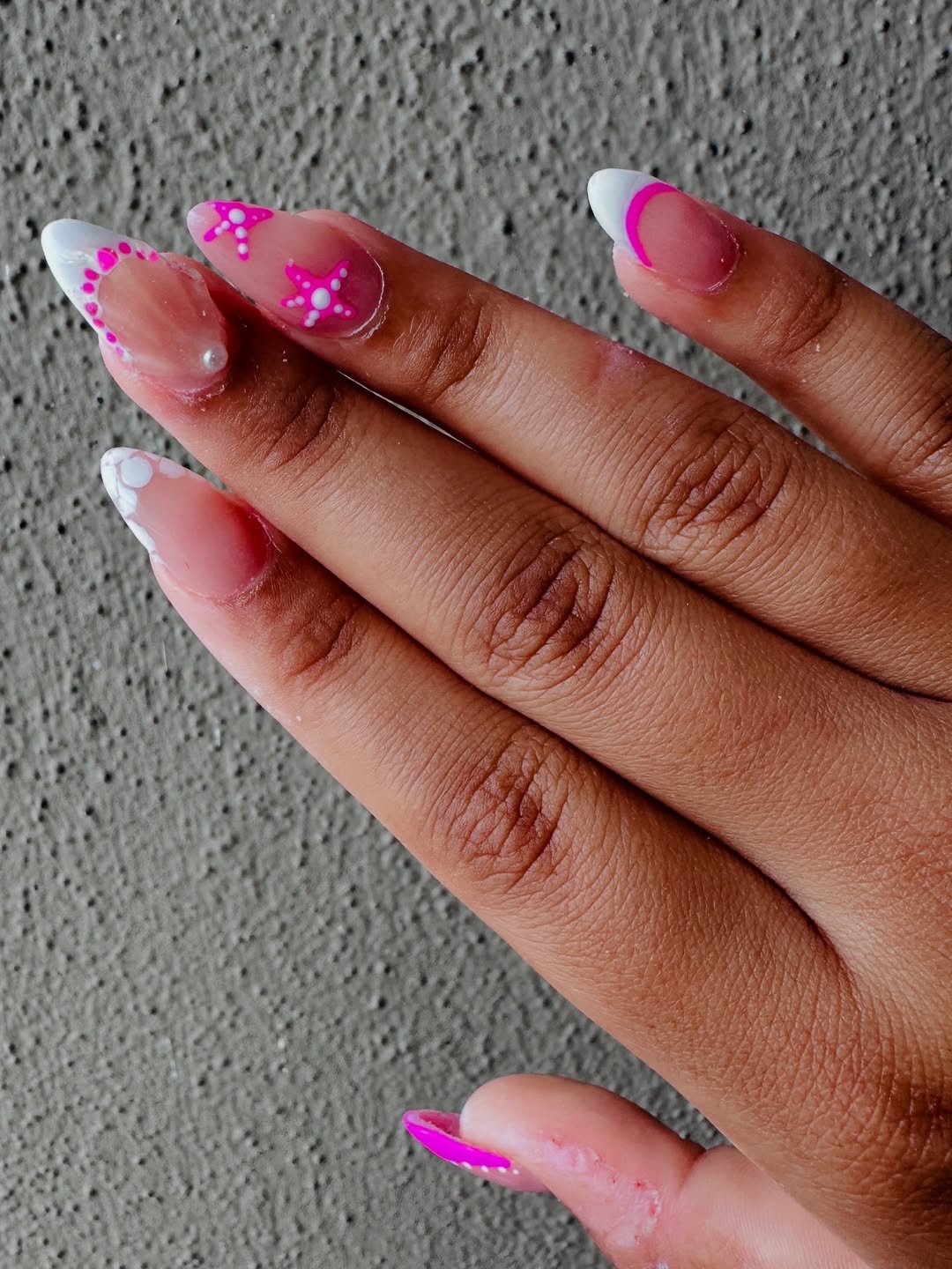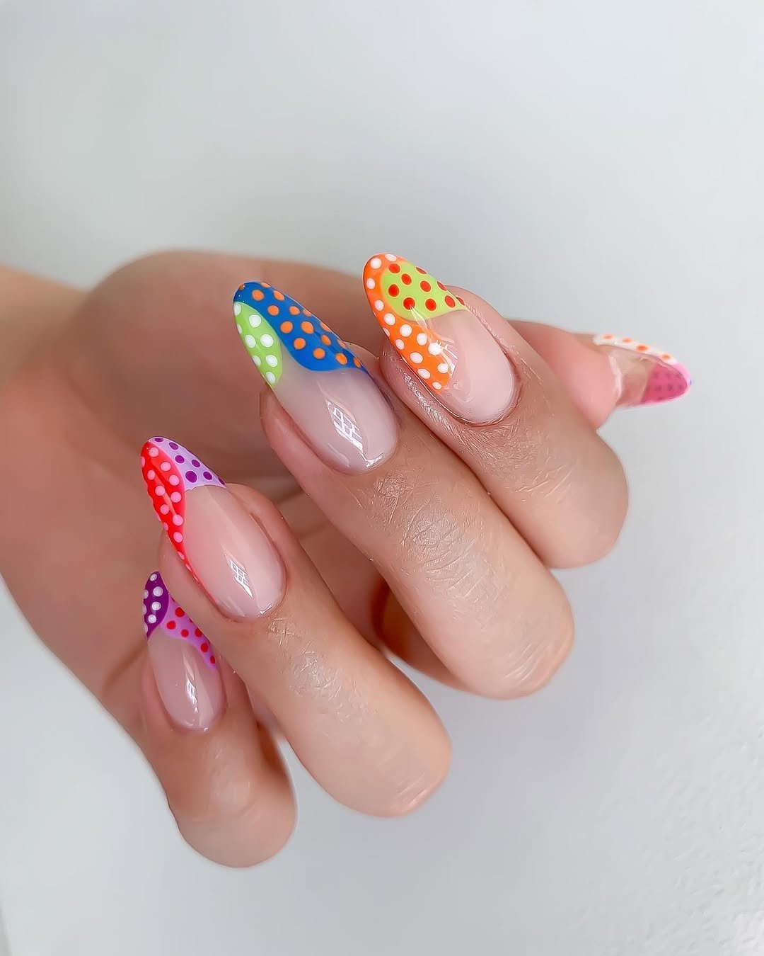 Classic French tips get a twist with bold colors and dotted accents. The shapes feel familiar, but the palette shifts everything.