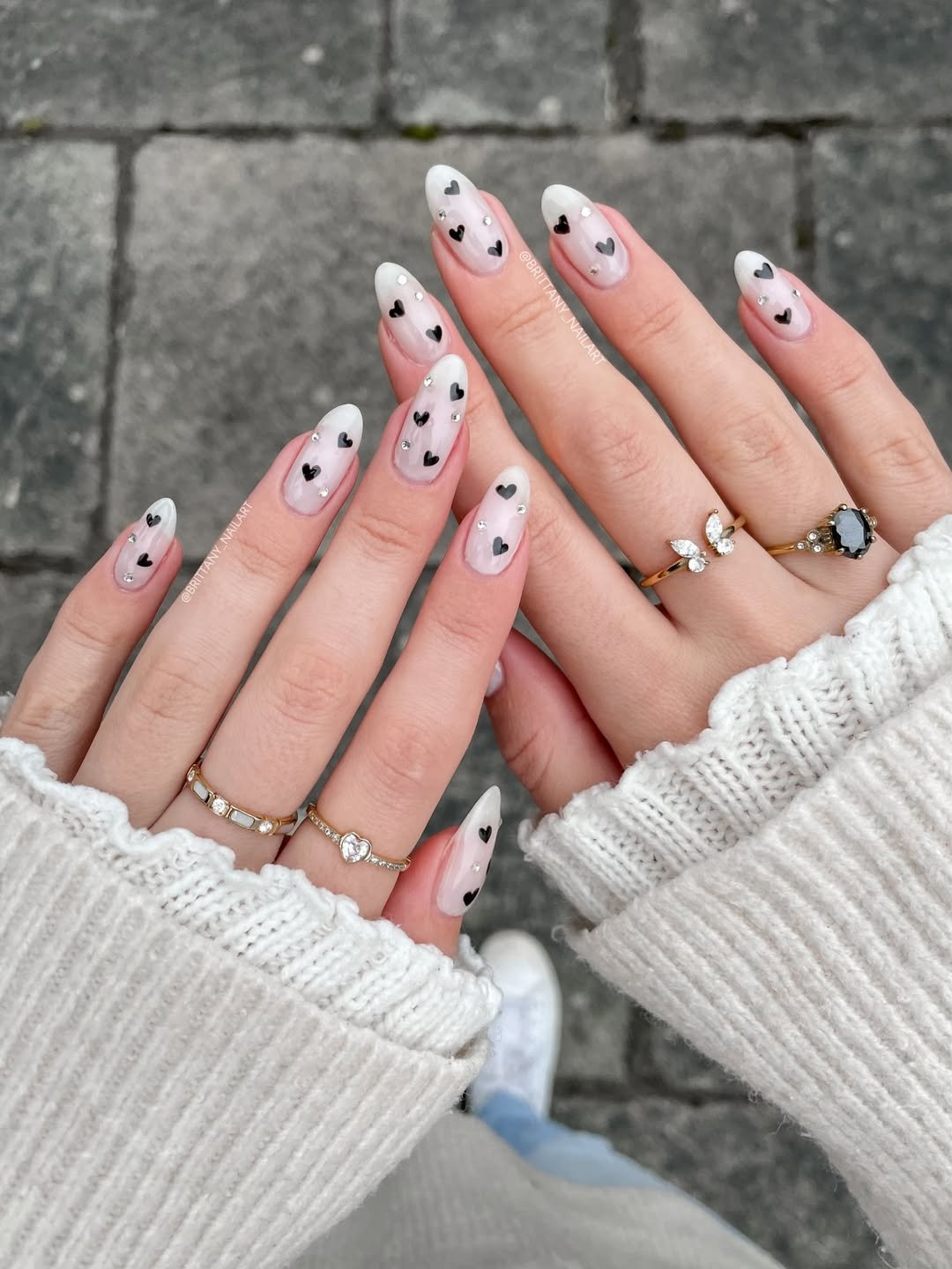 Sheer pink bases meet cloudy white tips, scattered with tiny black hearts and subtle sparkle. It feels romantic, but in a playful, undone way that suits June perfectly.