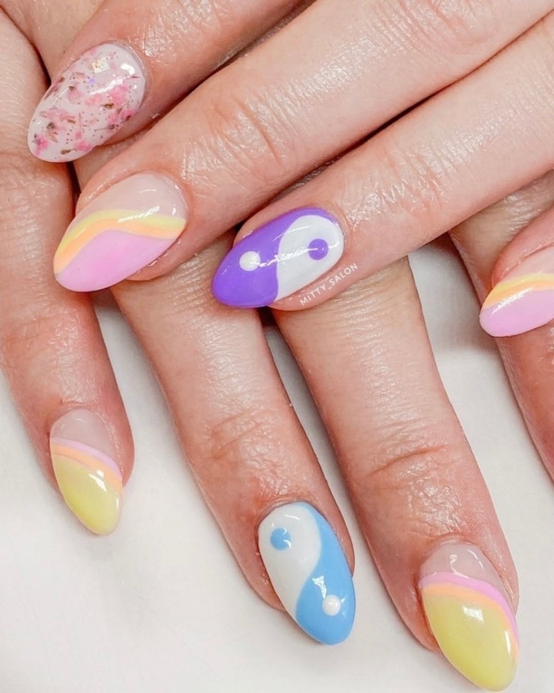 Abstract shapes and soft color blocking create a mix that feels modern and slightly nostalgic. Each nail tells a different story without clashing.