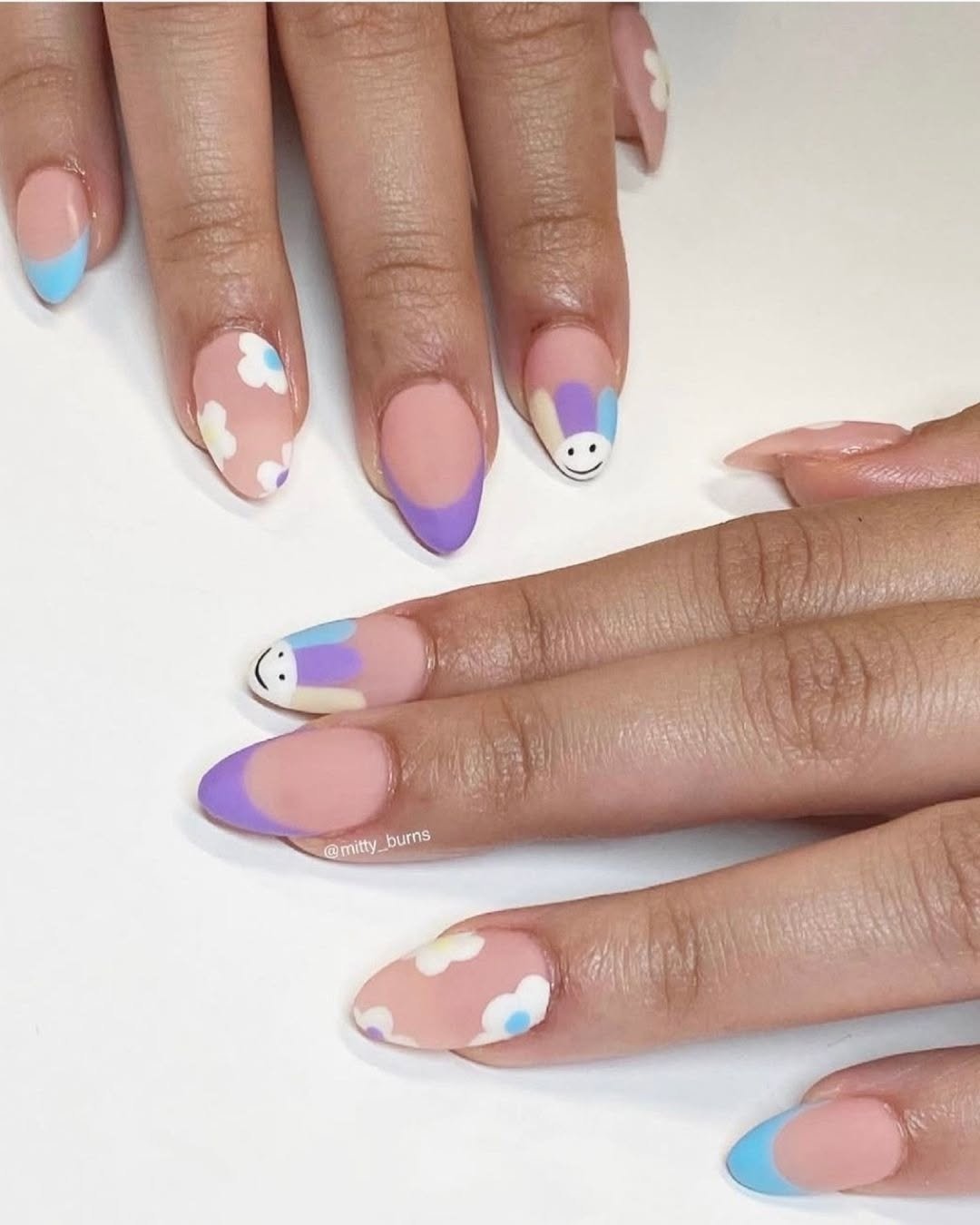 Soft lilac bases bloom with tiny floral accents that feel like pressed petals. The color sits somewhere between sweet and polished, never too loud.