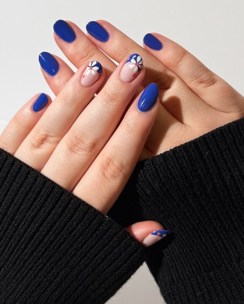 Deep blue polish meets delicate white florals, creating a contrast that feels crisp and polished. It’s simple, but never boring.