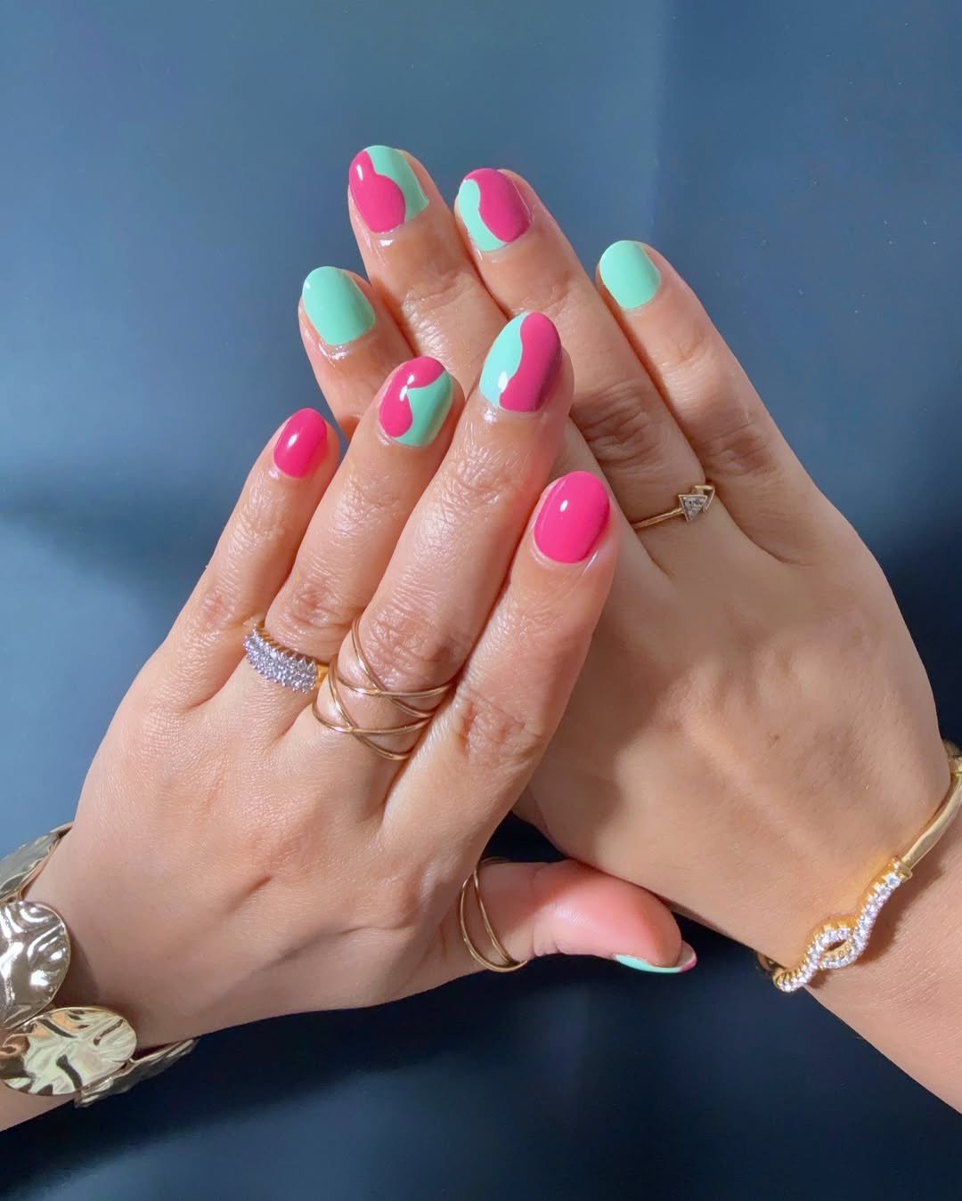 Mint green and bright pink swirl together in soft, rounded shapes that feel like melted gelato. The contrast is bold, but the curves keep it feeling smooth and balanced.