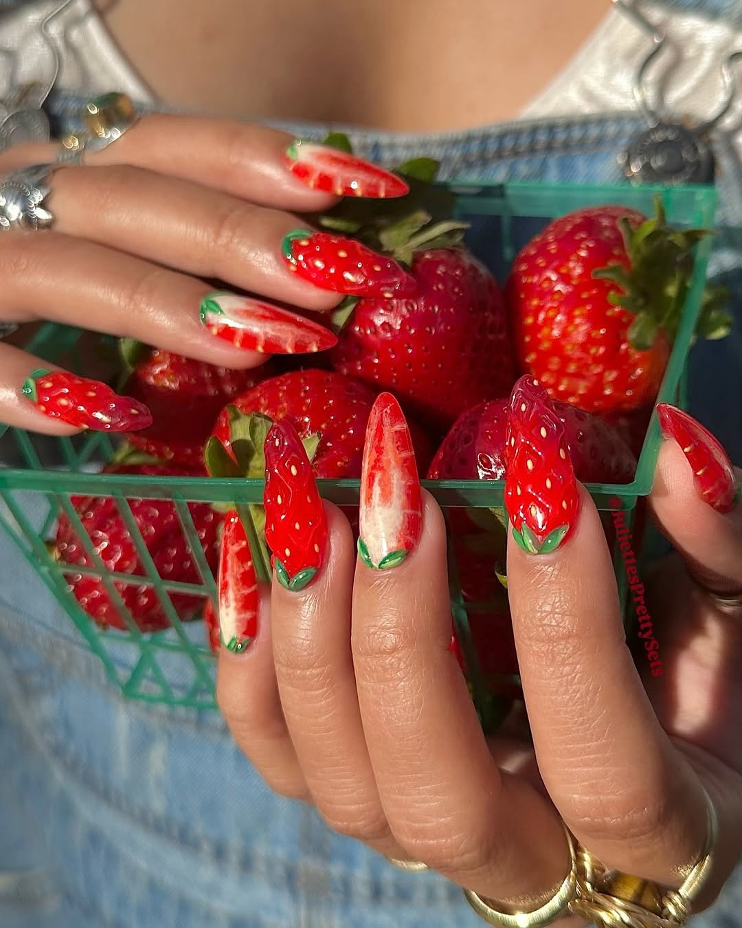 Juicy reds drip into soft nude bases, finished with tiny seeds and leafy green tips that feel almost edible. There’s a glossy richness that makes the whole set pop.