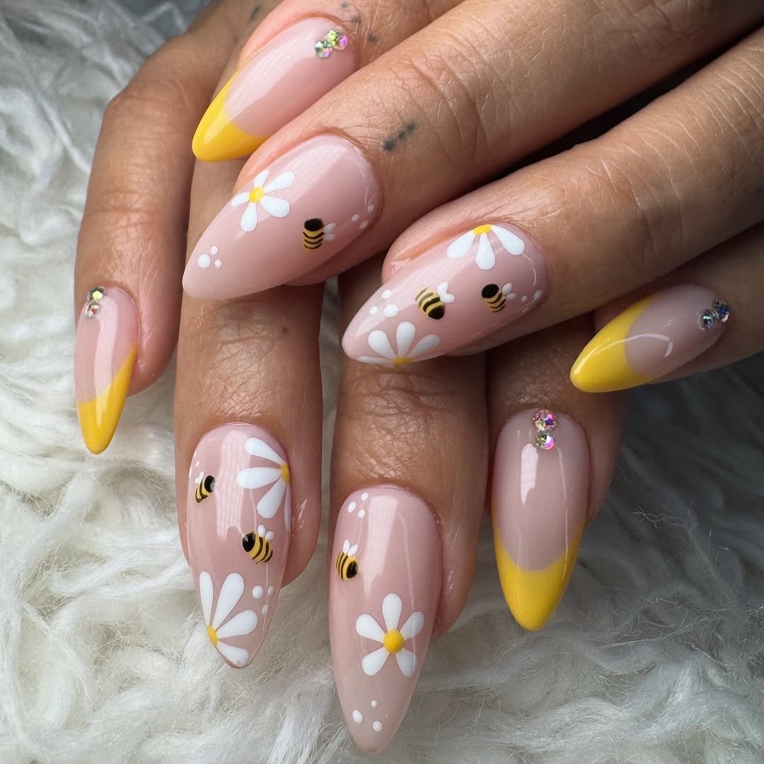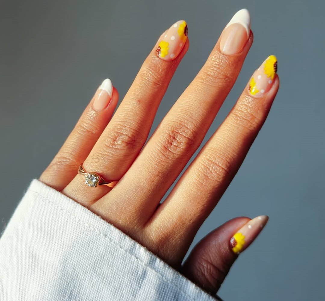 Soft nude bases meet crisp white tips, then suddenly little yellow florals bloom across the edges like June mornings. It feels fresh, light, and just playful enough to catch the sun when you move your hands.